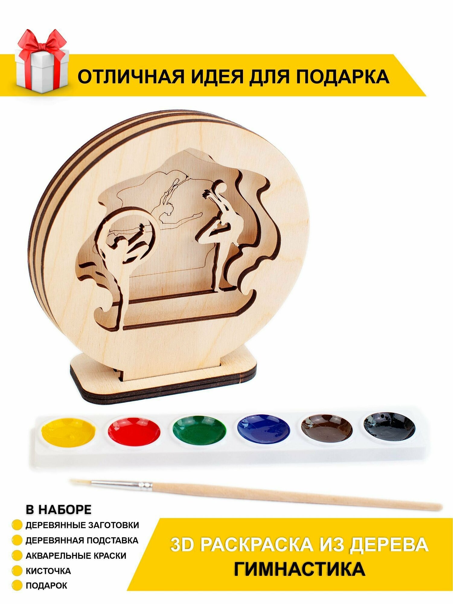 | Подробная комплектация | Деревянные заготовки - 3 шт; краски акварель - 6 цветов; деревянная подставка; кисточка; инструкция; подарок |