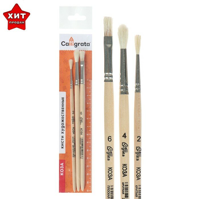 Набор кистей Коза 3 штуки, Calligrata №1 (круглые №: 2, 4 ; плоская №6), деревянная ручка, пакет интересное: