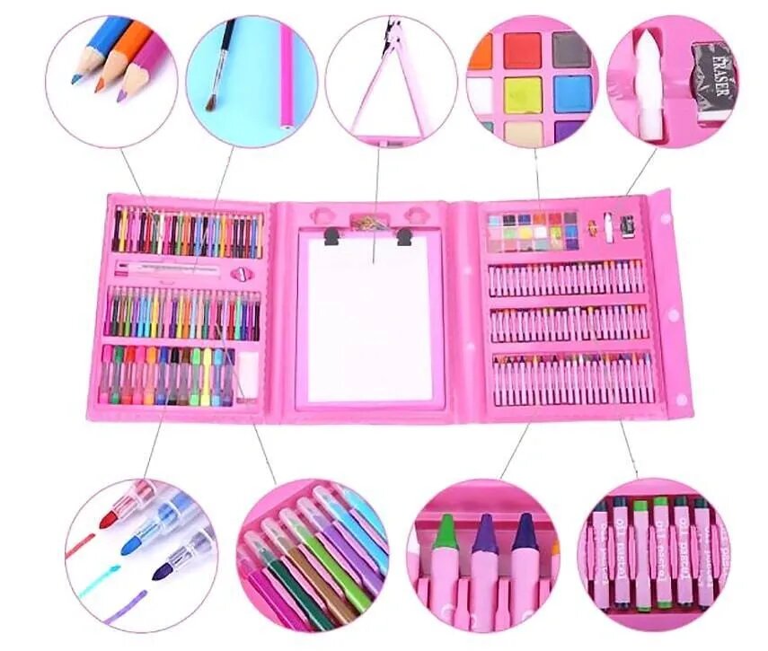 Набор для рисования "Чемоданчик юного художника", 208 предметов: карандаши, кисти, краски, фломастеры. с мольбертом, розовый интересное: