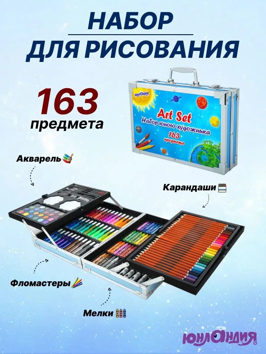 Подарочный набор юного художника для рисования, детского творчества в школу, краски, кисти, карандаши, 165 предметов в кейсе, Юнландия Космос, 665671