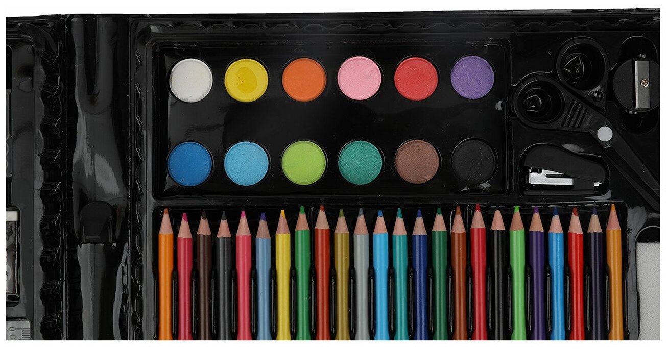 | Состав набора | карандаши / кисточка / краска / ластик / линейка / мелки / палитра / пастель / сумка для переноса / точилка / фломастеры |