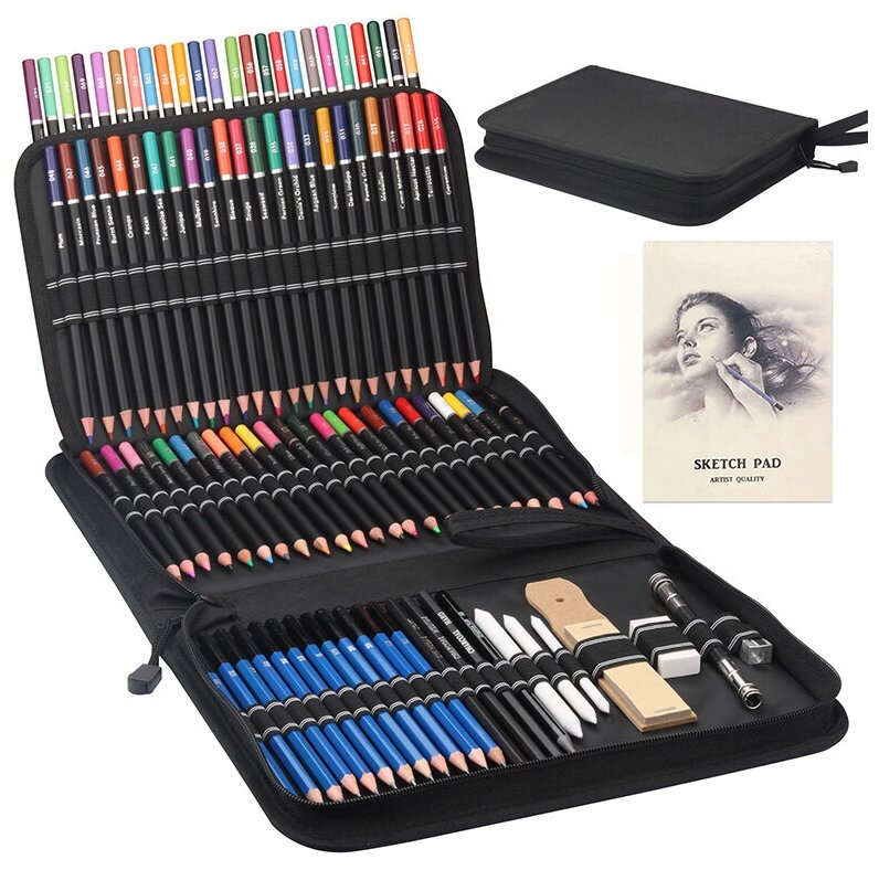 | Комплектация | 72- Цветных карандаша 12- Графитных карандашей (HB, 2H, 3H, 4H, 5H, B, 2B, 3B, 4B, 5B, 6B, 8B) 3- Угольных карандаша (мягкий/средний/жесткий диск) 1- Угольный карандаш 3- Растушевки (большой/средний/маленький) 1- Блок наждачной бумаги 1- Удлинитель для карандашей с двойной головкой 1- Ластик 1- Точилка 1 - Скетчбук A5 и чехол на молнии |
