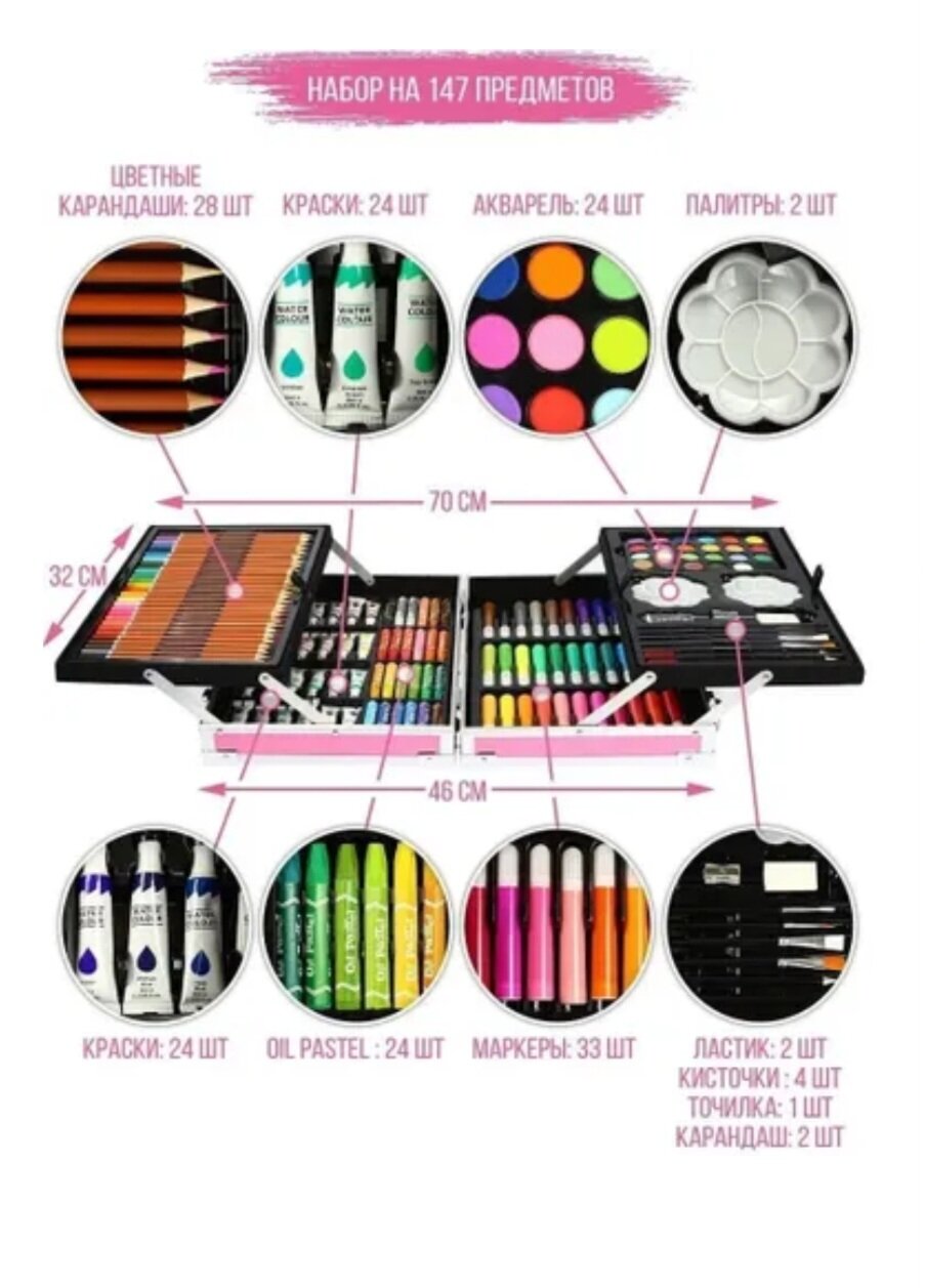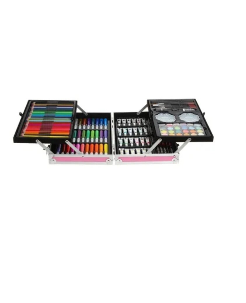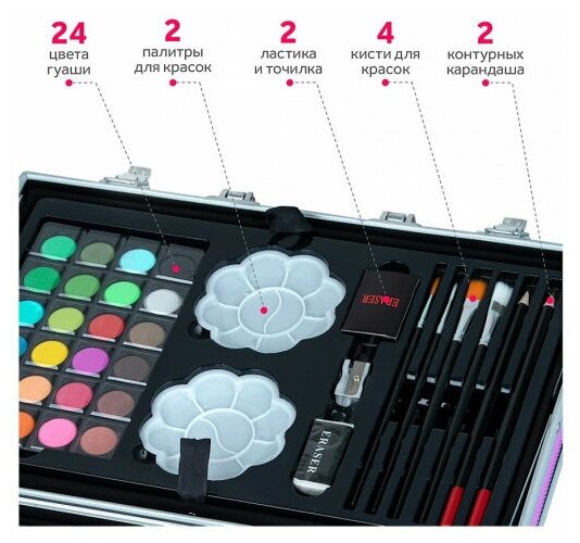 | Комплектация | Масляные краски 24 штуки, пастель 24 штуки, фломастеры 33 штуки, цветные карандаши 28 штук, акварельные краски 24 штуки, кисти 4 штуки, контейнеры для красок 2 штуки, простые карандаши 2 штуки, ластик, замешанный ластик, точилка, кейс |