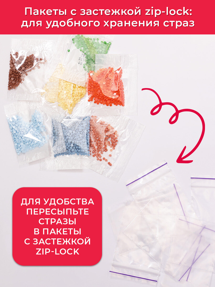 | Комплектация | - тканая основа с клеевым слоем и защитной плёнкой, натянутая на деревянный подрамник с подрамником, - квадратные стразы: 7 цветов, с запасом 20%, - стилус и восковая пластина, - пластиковый лоток, - крепление для подвешивания картины на стену, - пакеты зип-лок для удобного хранения страз |