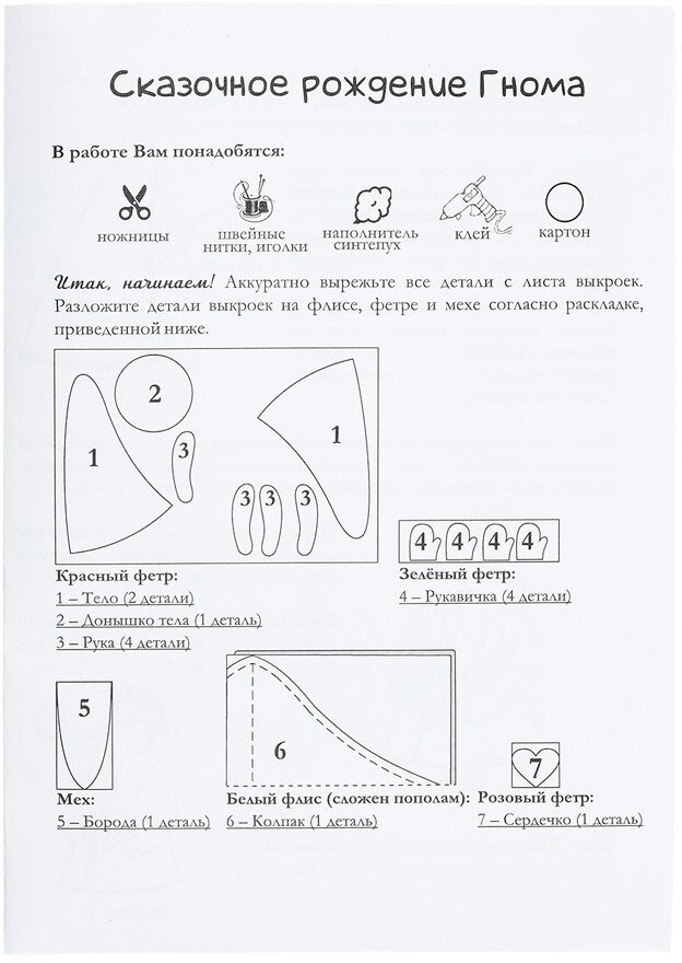 | Комплектация | Флис, фетр, помпоны, искусственный мех, фурнитура, нитки мулине, бусинка, лист с выкройками персонажа, лента, мешочек, инструкция. Размер готовой игрушки 17 см |
