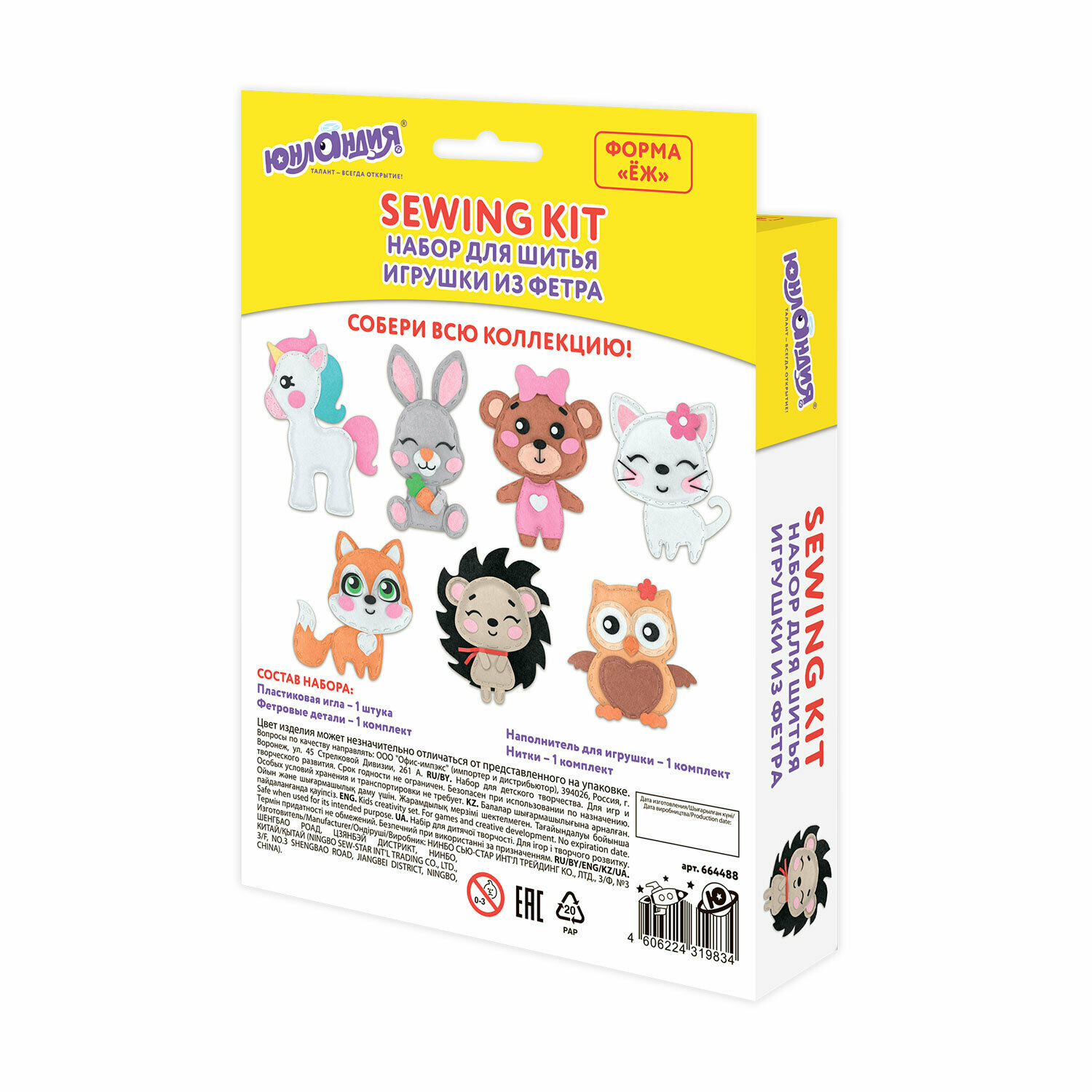 Набор для шитья игрушки из фетра "Ёжик", юнландия, 664488, 664488