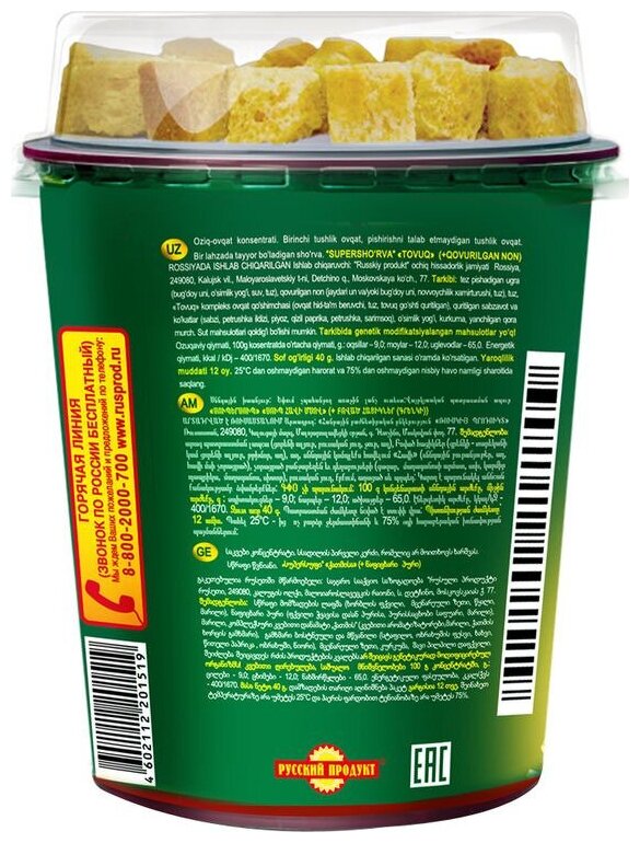 | Способ приготовления | Залейте содержимое стакана 0,3 л кипятка и перемешайте. Накройте крышкой и дайте настояться 5 минут. Добавьте гренки. Вкусный суп готов! |