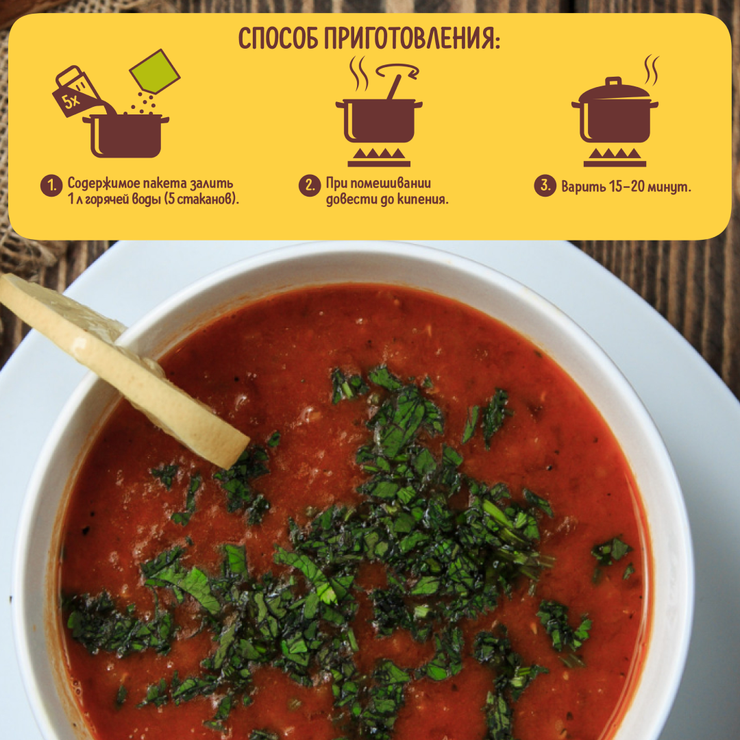 | Способ приготовления | Содержимое пакета залить горячей водой в количестве 1,0 л (5 стаканов) / при помешивании довести до кипения и варить 15-20 минут. |