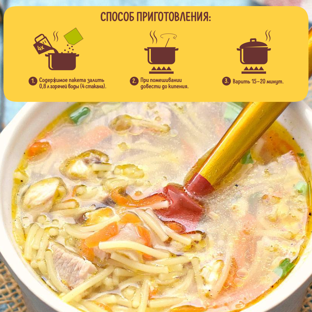 | Способ приготовления | Содержимое пакета залить горячей водой в количестве 1,0 л (5 стаканов) / при помешивании довести до кипения и варить 10-15 минут. |