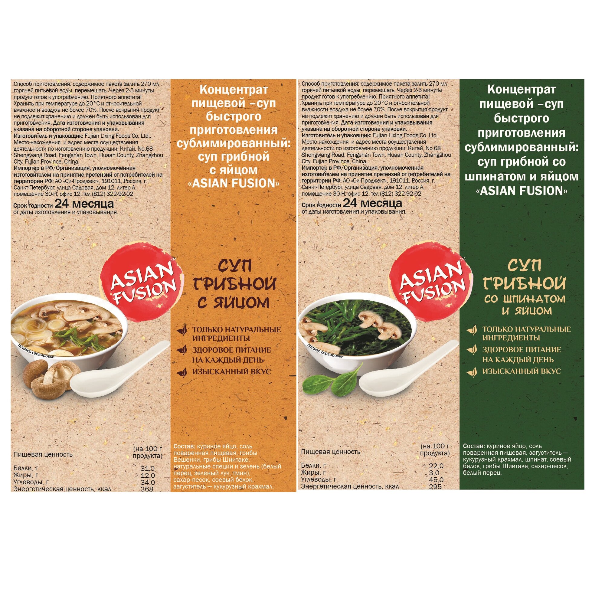 | Состав | грибы шиитаке, гриб вешенка, белый гриб, шпинат, яйцо куриное, кукурузный крахмал, соевый белок, лук зеленый, соль, сахар |
