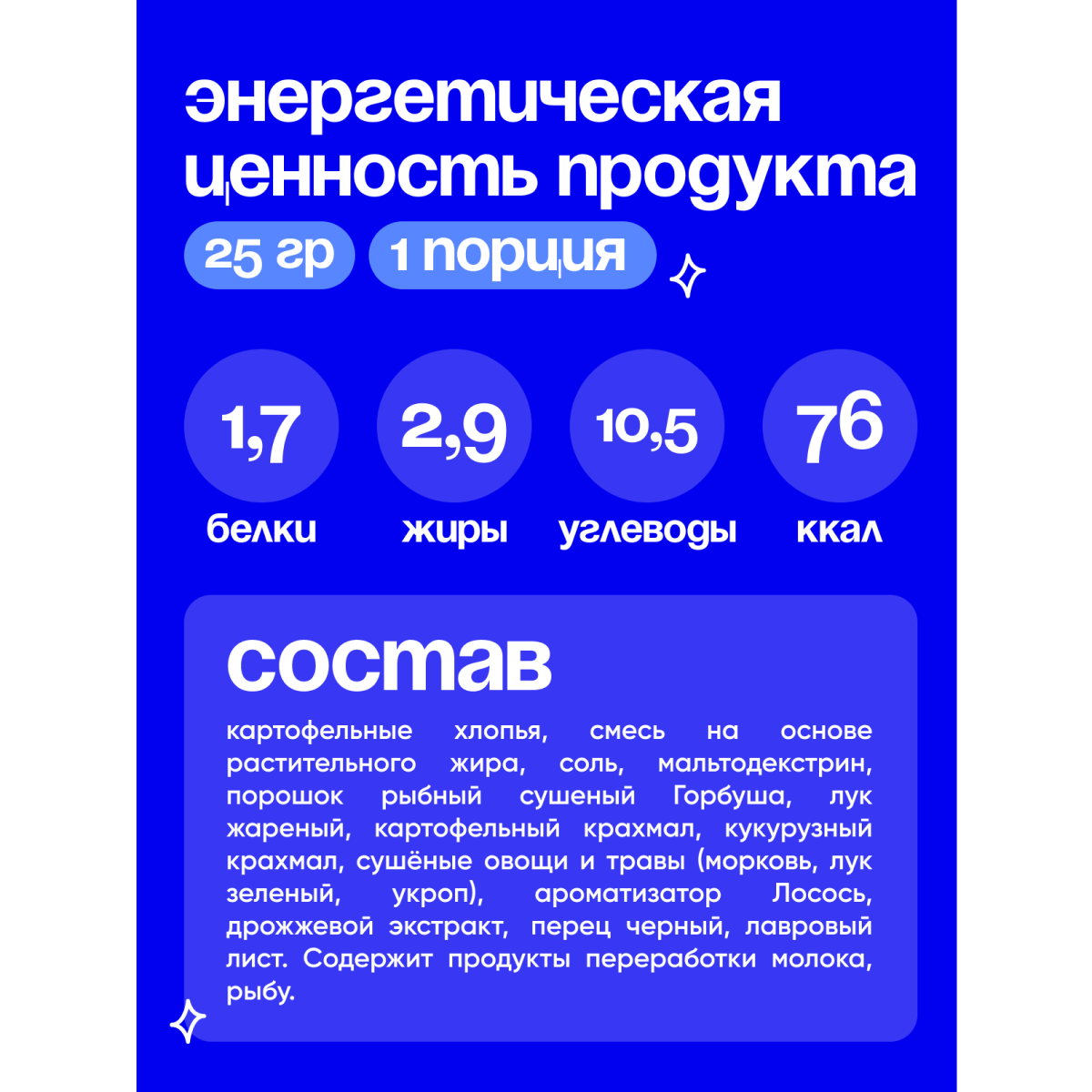 | Состав | картофельные хлопья, соль, мальтодекстрин, рыбный порошок горбуша, лук жареный, картофельный крахмал, кукурузный крахмал, растительный жир, сушеные овощи, сушеные травы, перец черный, лавровый лист |