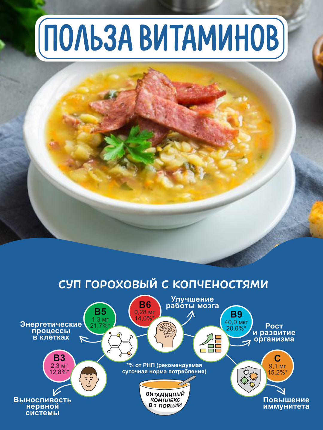 | Состав | Горох варено-сушеный, соль, свинина сырокопченая (свинина, соль, нитритно-посолочная смесь (соль, фиксатор окраски - нитрит натрия), сахар), морковь сушеная, лук сушеный, масло растительное, усилитель вкуса и аромата (глутамат натрия 1-замещенный), премикс витаминный, экстракт перца черного. Может содержать следы пшеничного глютена, сельдерея и молочных продуктов. |