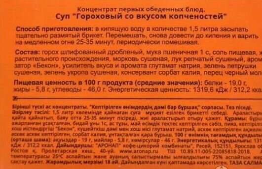 | Состав | Горох шлифованный дробленый, мука пшеничная 1 сорта, соль пищевая, жир растительного происхождения, морковь сушеная, лук репчатый сушеный, ароматизатор Бекон, усилитель вкуса и аромата глутамат натрия, зелень петрушки сушеная, зелень укропа сушеная, сорбат калия, перец черный молотый. |
