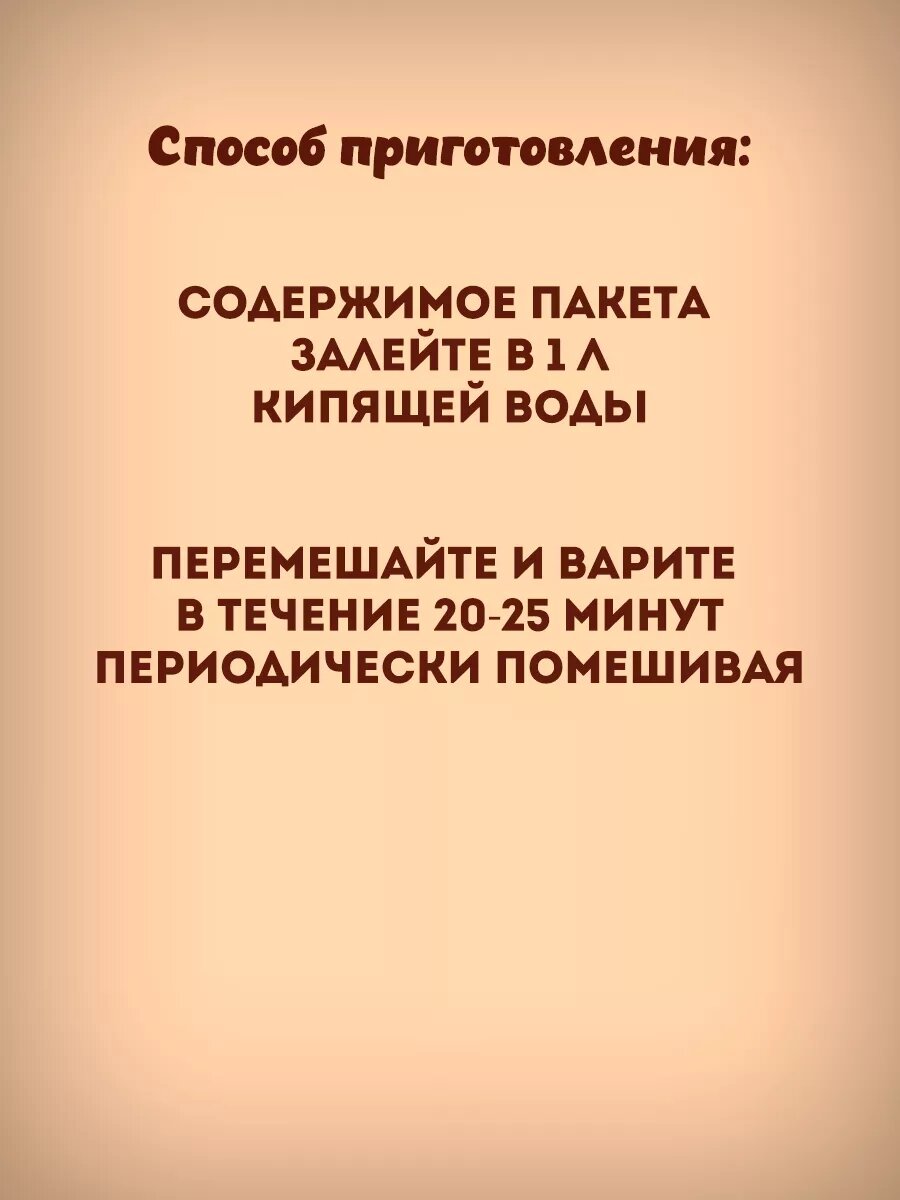 | Способ приготовления | содержимое пакета залейте 1л кипящей воды. Перемешайте и варите в течении 20-25 минут / периодически помешивая. |