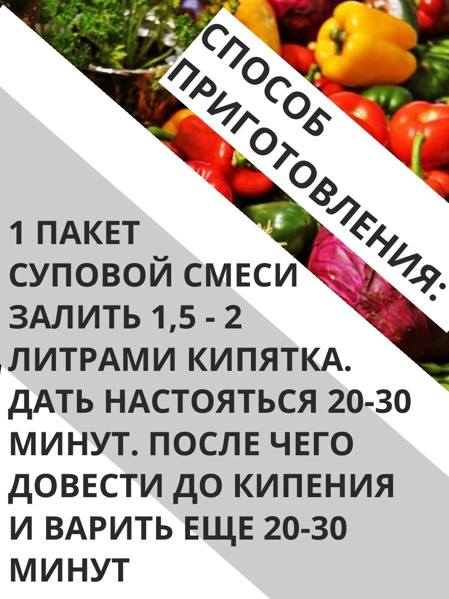 | Способ приготовления | 1 пакет суповой смеси залить 1,5-2 литрами кипятка. Дать настояться 20-30 минут / после чего довести до кипения и варить еще 20-30 минут |