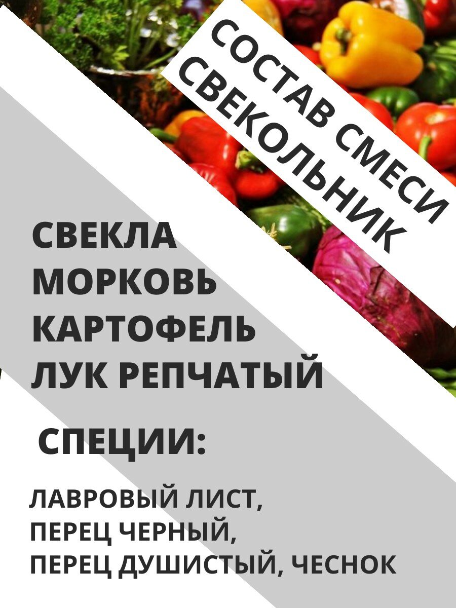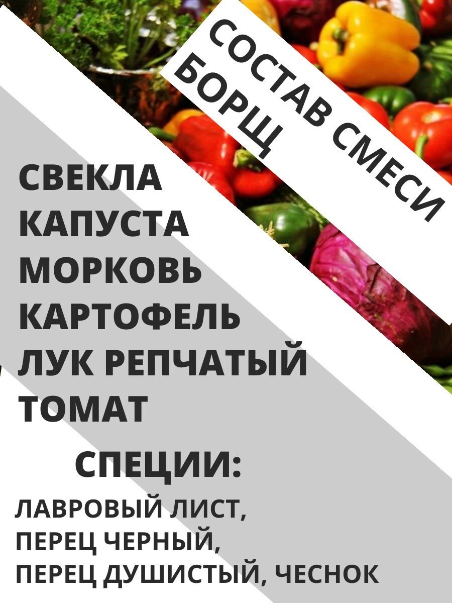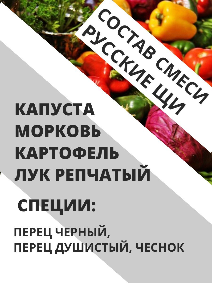 | Состав | БОРЩ : СМЕСЬ СУШЕНЫХ ОВОЩЕЙ Состав в одном пакете: капуста - 20г., свекла - 20 гр., картофель - 20гр., морковь - 15 гр., репчатый лук - 10 гр., томат - 13г., лавровый лист - 1 шт., чеснок сушеный - 2 гр., черный перец - 5 шт., душистый перец - 3 шт. СВЕКОЛЬНИК: СМЕСЬ СУШЕНЫХ ОВОЩЕЙ Состав в одном пакете: свекла - 35 гр., картофель - 32гр., морковь - 20 гр., репчатый лук - 10 гр., лавровый лист - 1 шт., чеснок сушеный - 2 гр., черный перец - 5 шт., душистый перец - 3 шт. РУССКИЕ ЩИ: СМЕСЬ СУШЕНЫХ ОВОЩЕЙ Состав в одном пакете: КАПУСТА - 35 гр., картофель - 30гр., морковь - 20 гр., репчатый лук - 12 гр., чеснок сушеный - 2 гр., черный перец - 5 шт., душистый перец - 3 шт. |