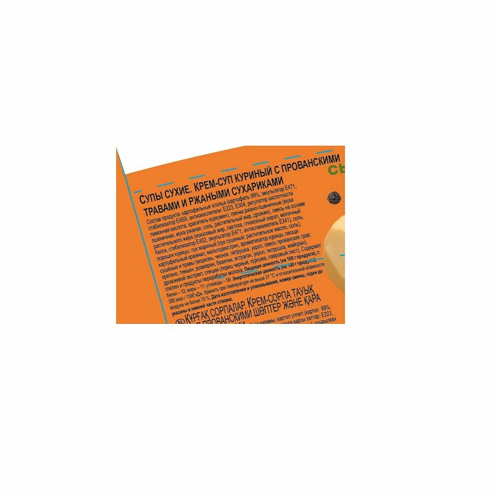 | Состав | картофельные хлопья; гренки ржано-пшеничные; растительный жир; соль; курица, лук жареный, картофельный крахмал, мальтодекстрин, овощи сушеные, травы сушеные, дрожжевой экстракт, специи |