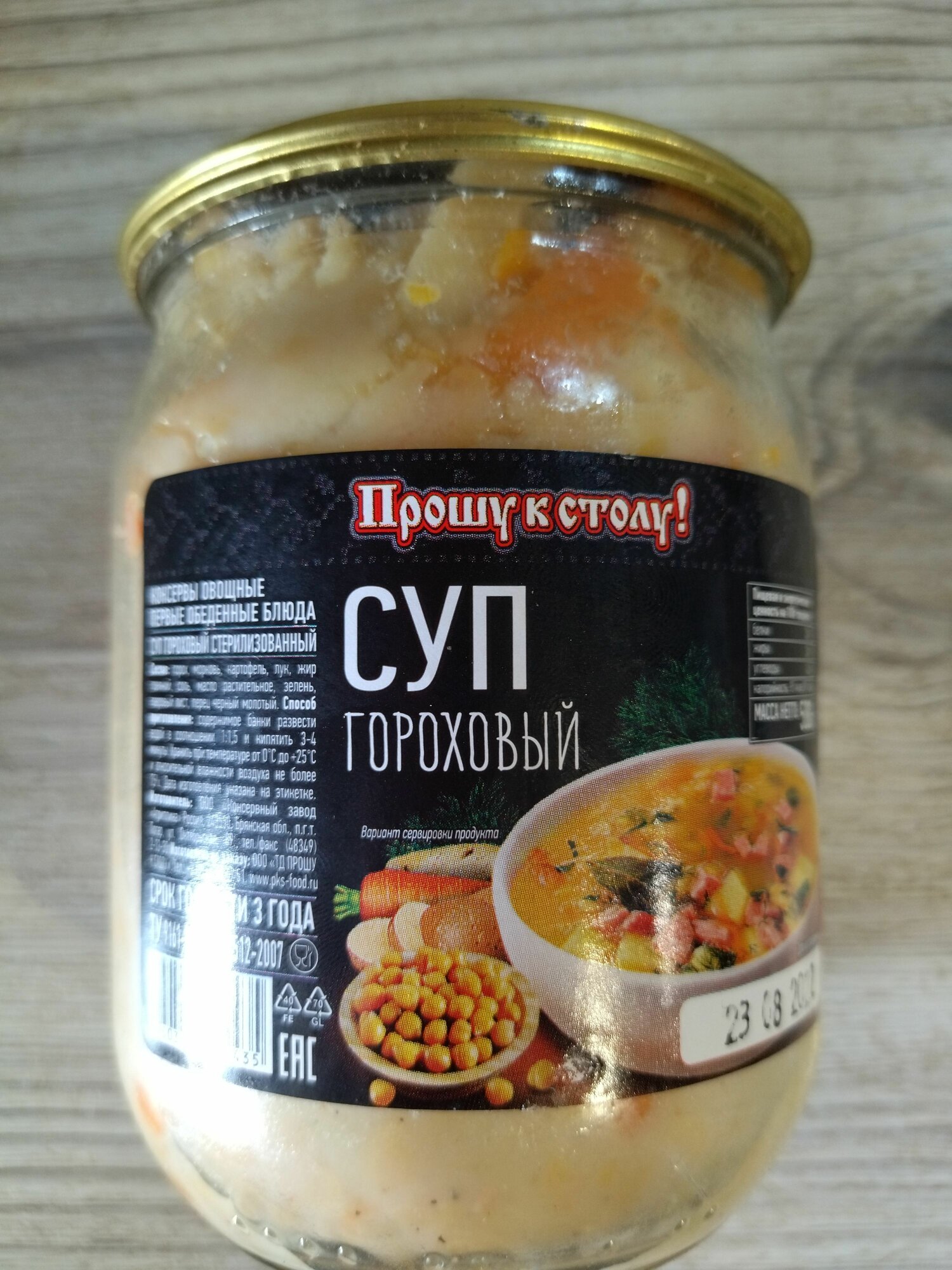 | Состав | горох, морковь, картофель, лук, жир говяжий, соль, масло растительное, зелень, лавровый лист, перец черный молотый. |