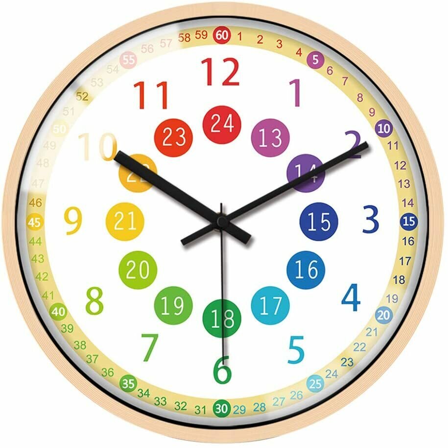 Купить Часы обучающие для детей настенные, обучают определять время,бесшумные в бежевой раме с яркими большими цифрами для детской комнаты
