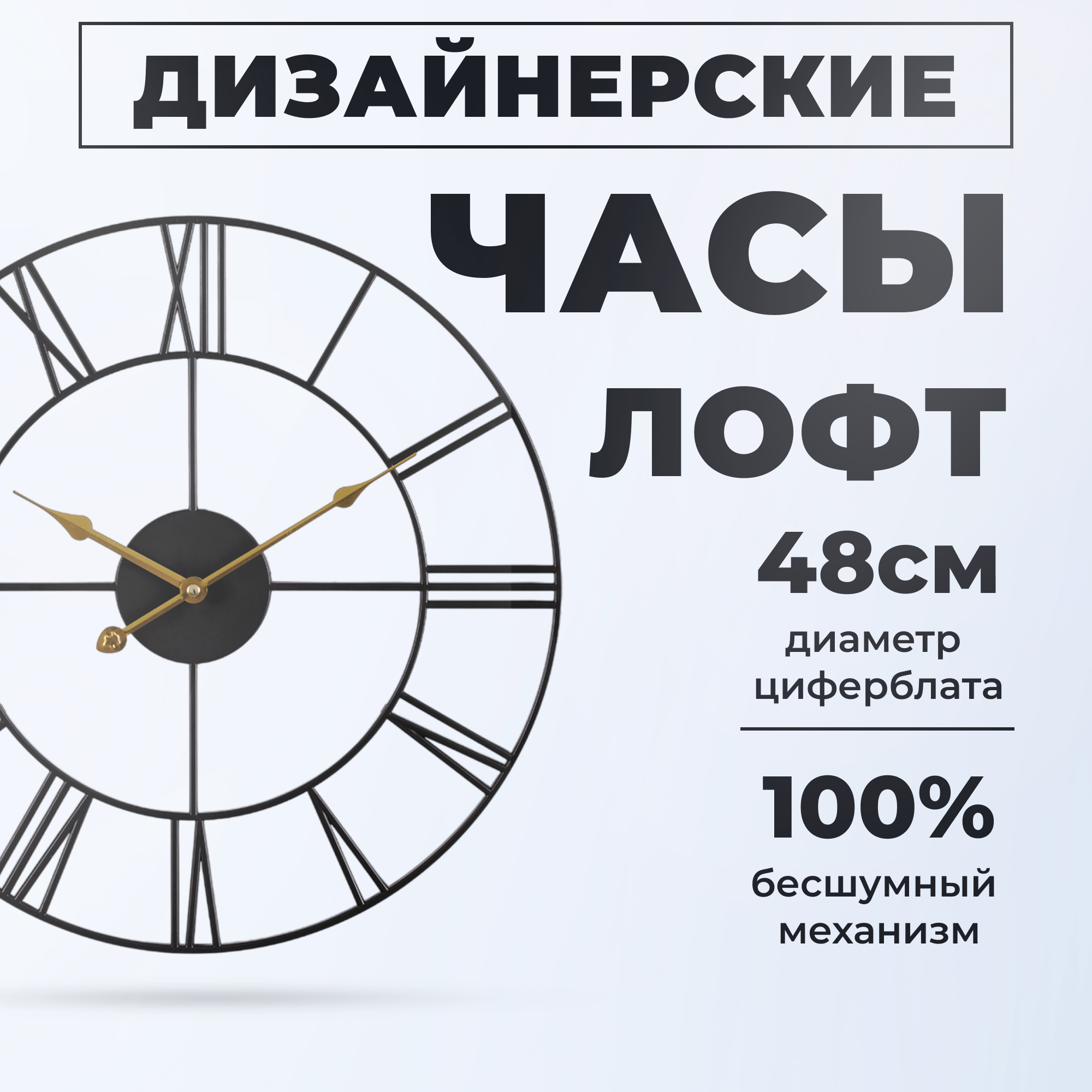 Большие настенные часы Лофт, бесшумные часы d=48 см, часы с римскими цифрами, открытая стрелка, Белый Золото