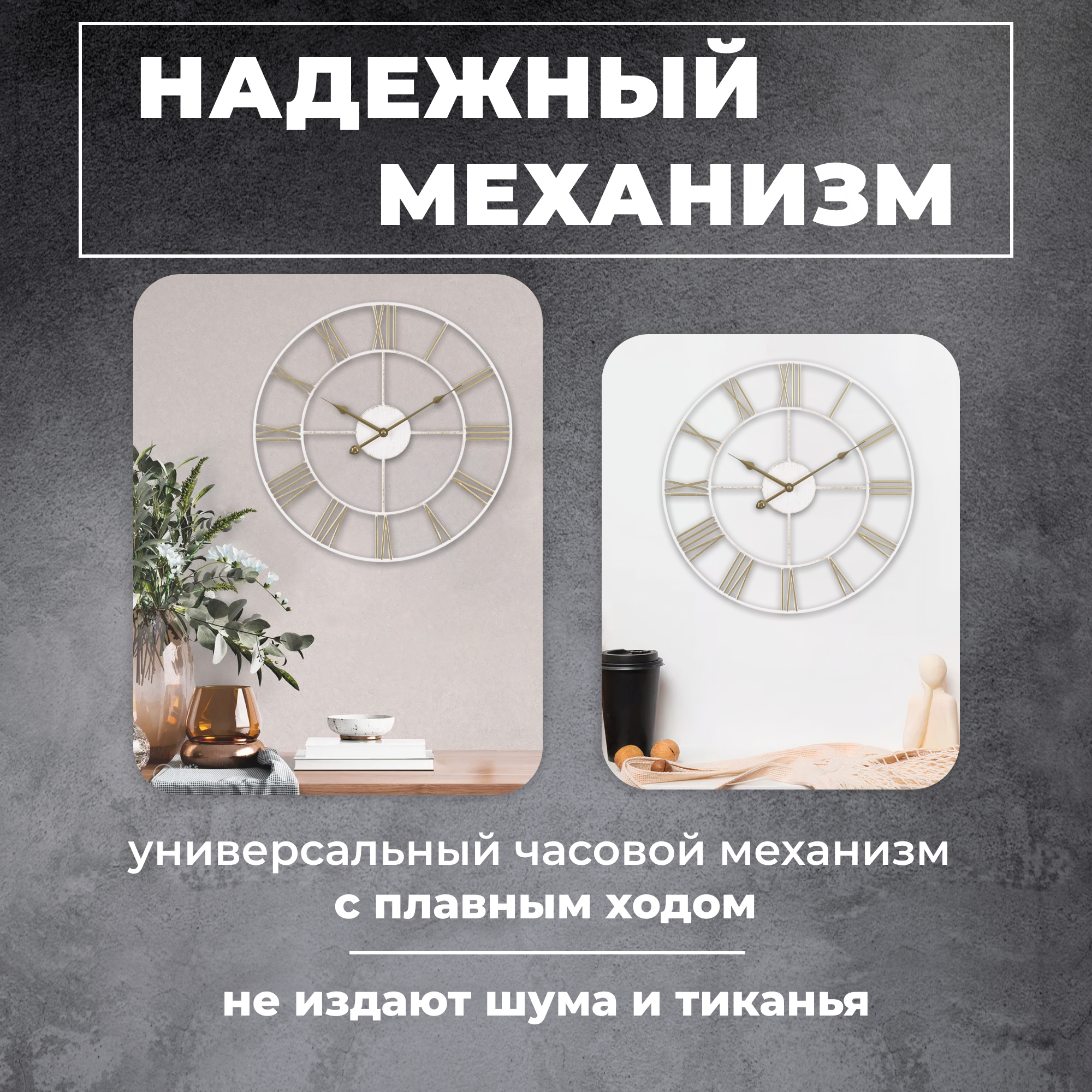 Большие настенные часы Лофт, бесшумные часы d=48 см, часы с римскими цифрами, открытая стрелка, Белый Золото