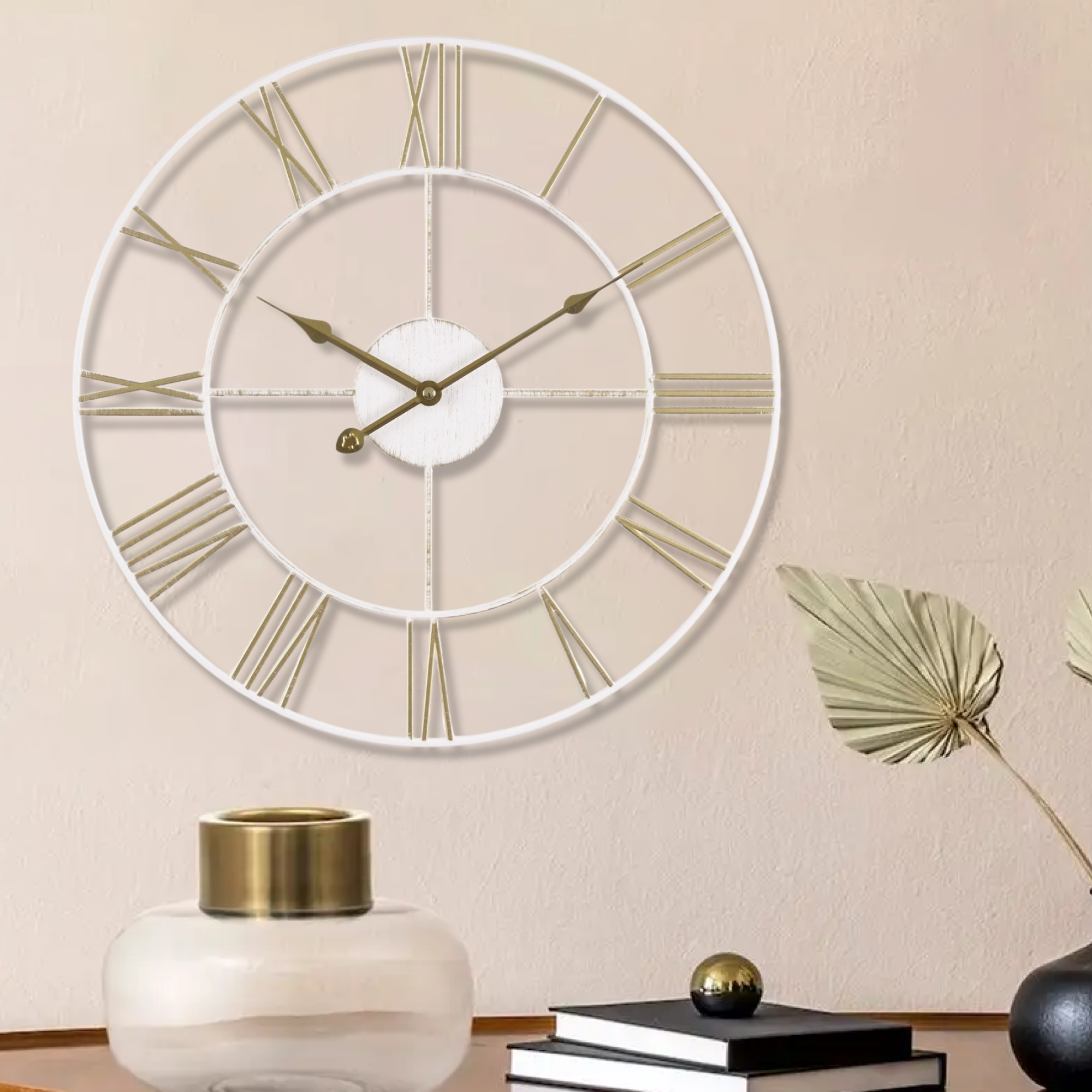 Большие настенные часы Лофт, бесшумные часы d=48 см, часы с римскими цифрами, открытая стрелка, Белый Золото/ Белые большие часы металл