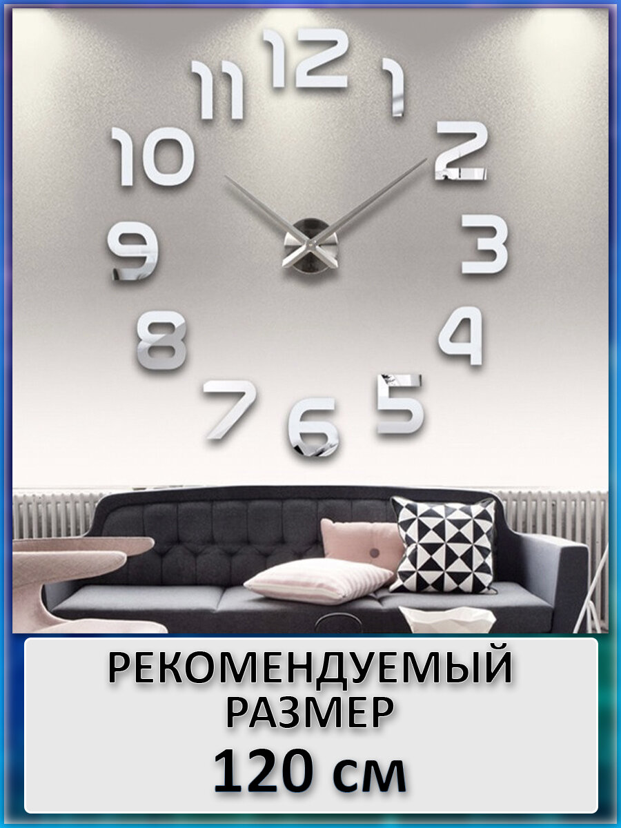 Большие настенные 3D часы MIRRON 120 D2-С/Кварцевый бесшумный механизм/Часы конструктор/Часы наклейка/120 см/Серый (серебристый) цвет интересное: