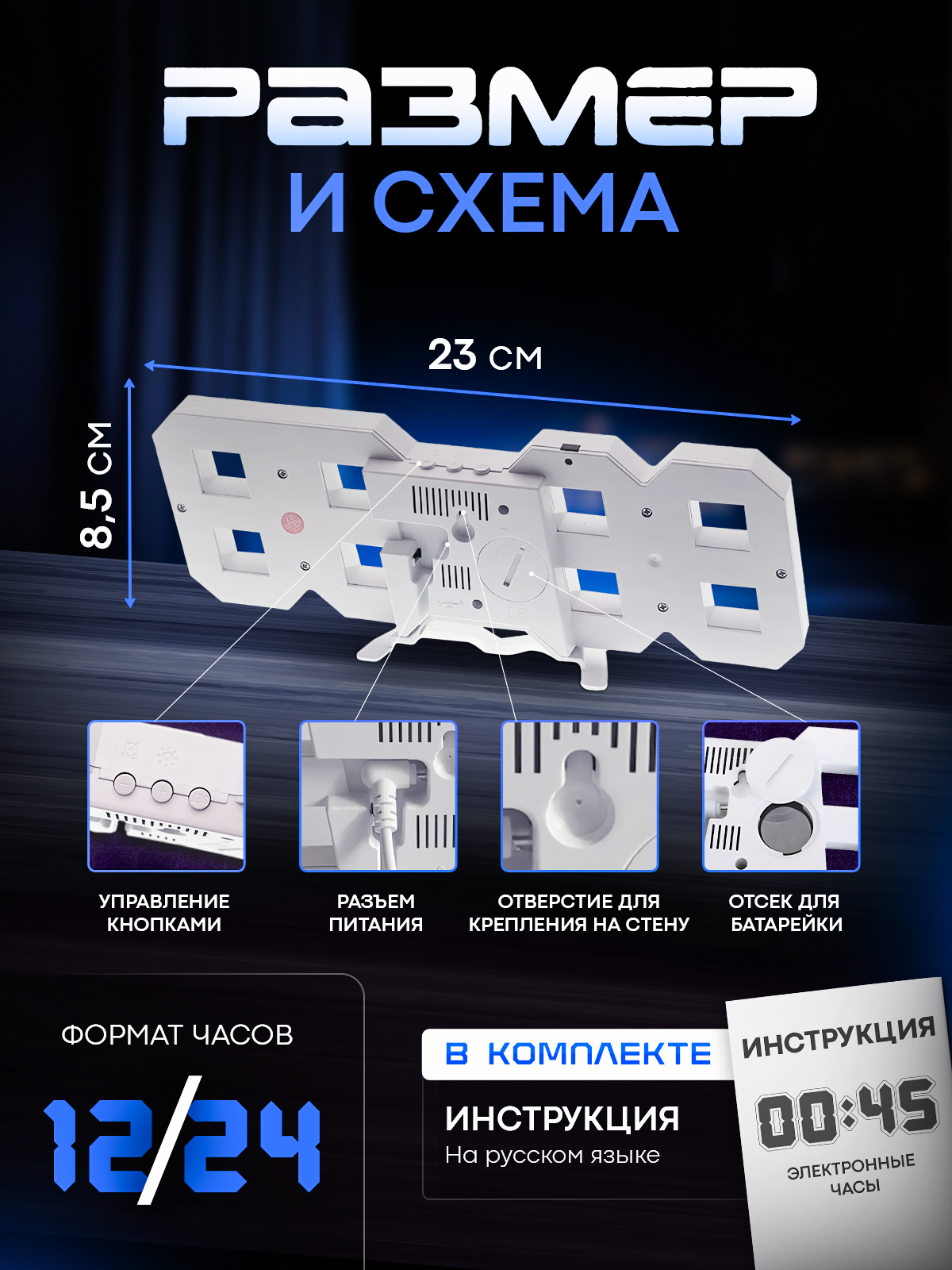 | Комплектация | Часы электронные, кабель для питания от USB порта, инструкция на русском языке |