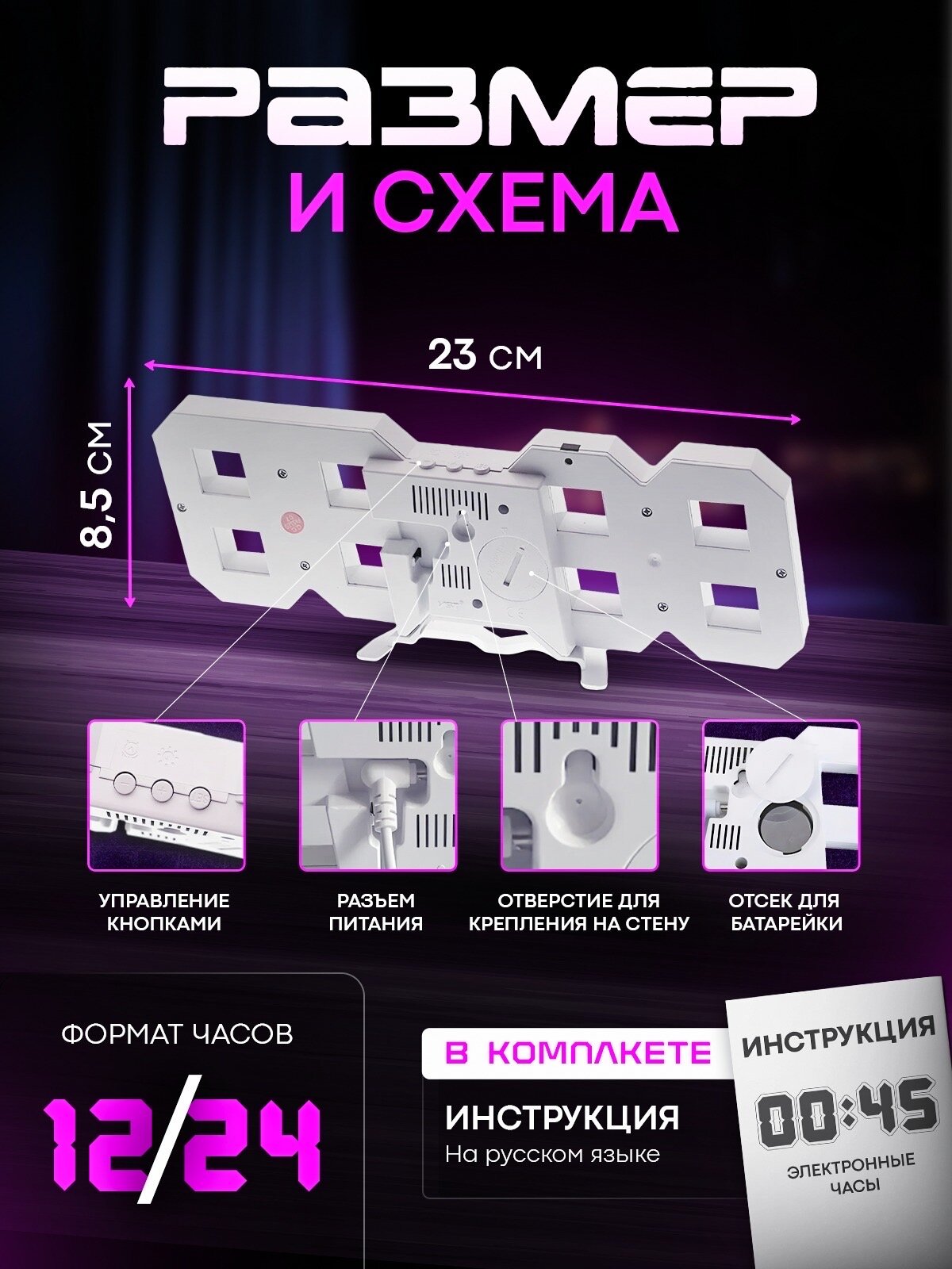 | Комплектация | Часы электронные, кабель для питания от USB порта, инструкция на русском языке |