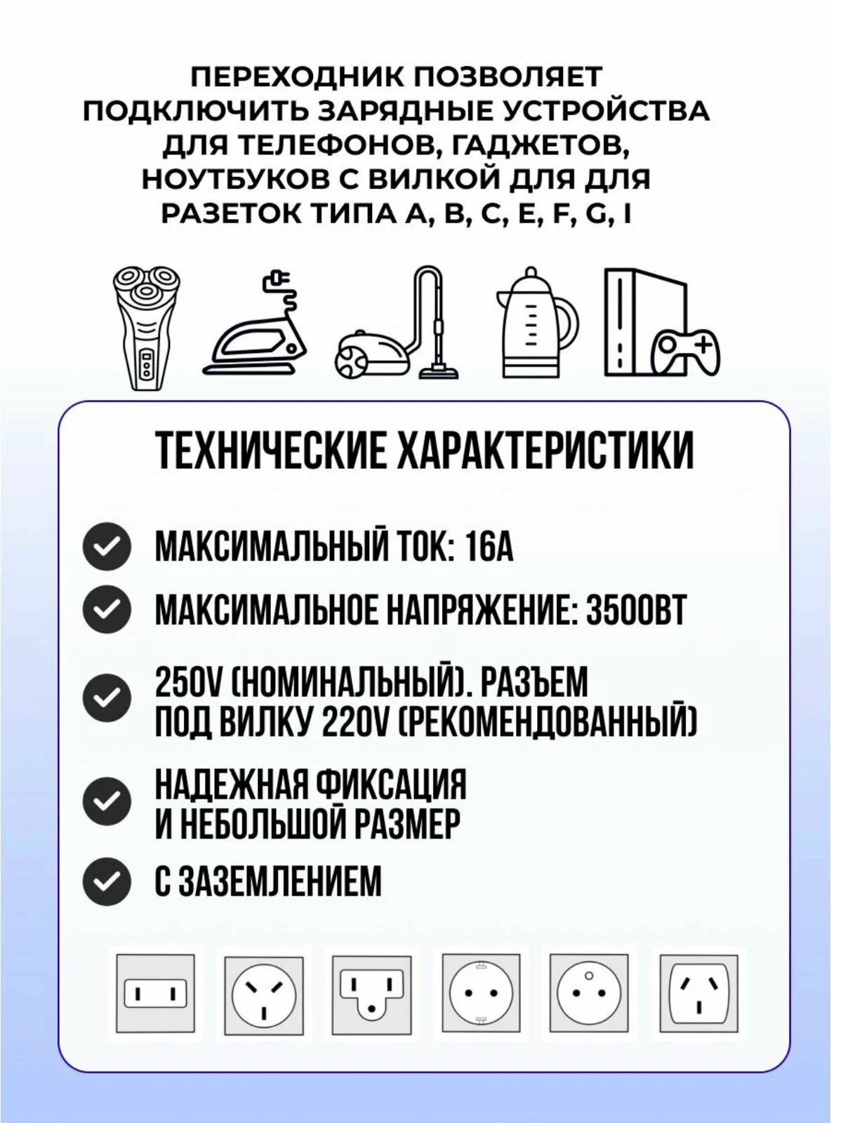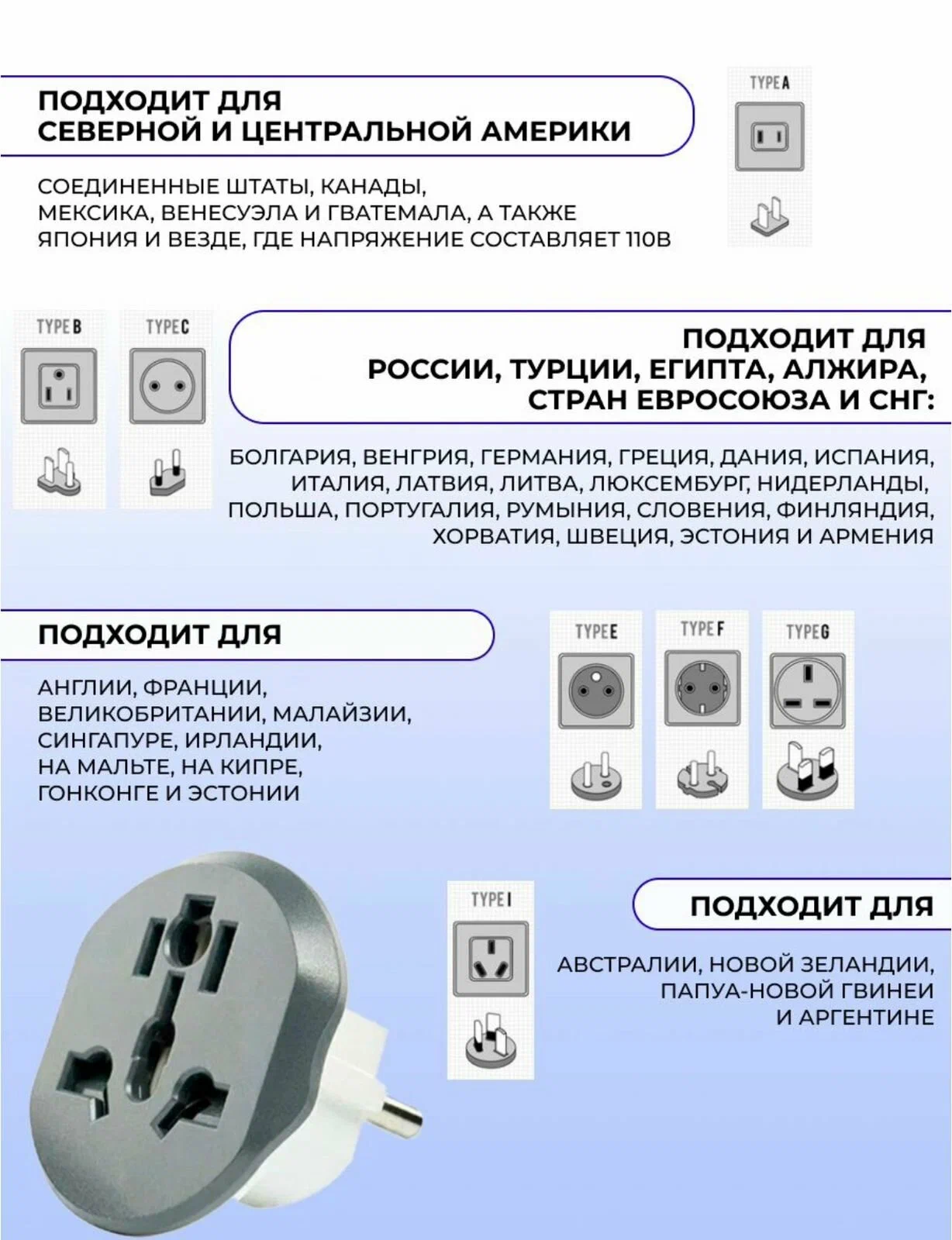 | Дополнительная информация | типы входной вилки: A, B, C, E, F, G, I; типы розеток: тип F (евророзетка); рабочая частота: 50 Гц; материал корпуса: ABS пластик |