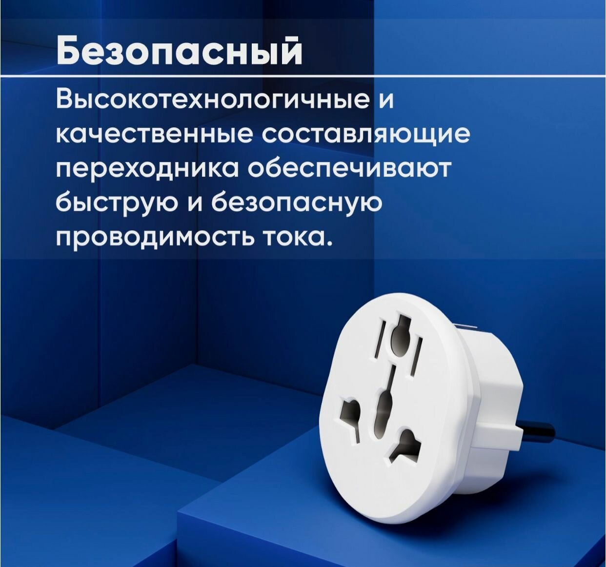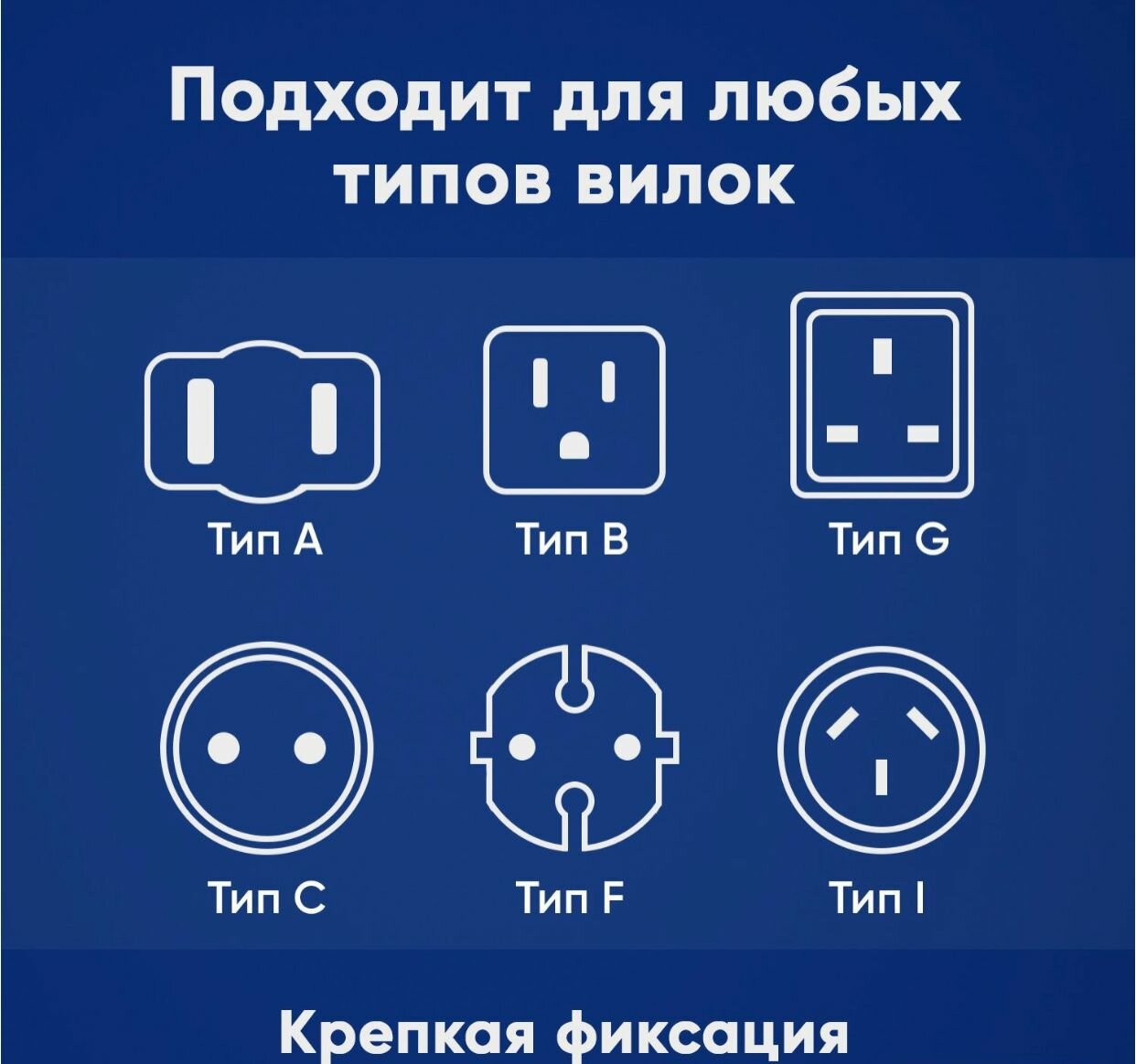 | Дополнительная информация | рассчитан на следующие типы входной вилки: А (Япония, Америка), В, С (Европа и Россия), E, F, G (Англия), I (Австралия, Новая Зеландия); типы розеток: F; рабочая частота: 50 Гц; материал корпуса: ABS пластик |