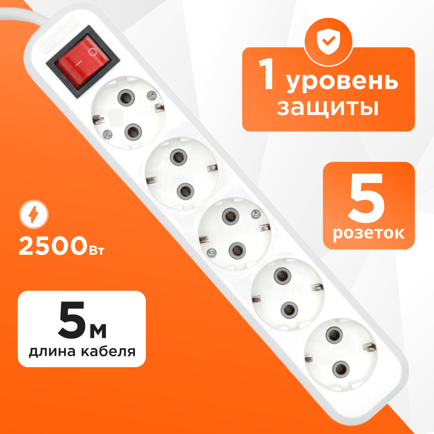 Удлинитель Гарнизон белый 10А 5м с выключателем и заземлением 1 уровень защиты EPB-G5-W-5