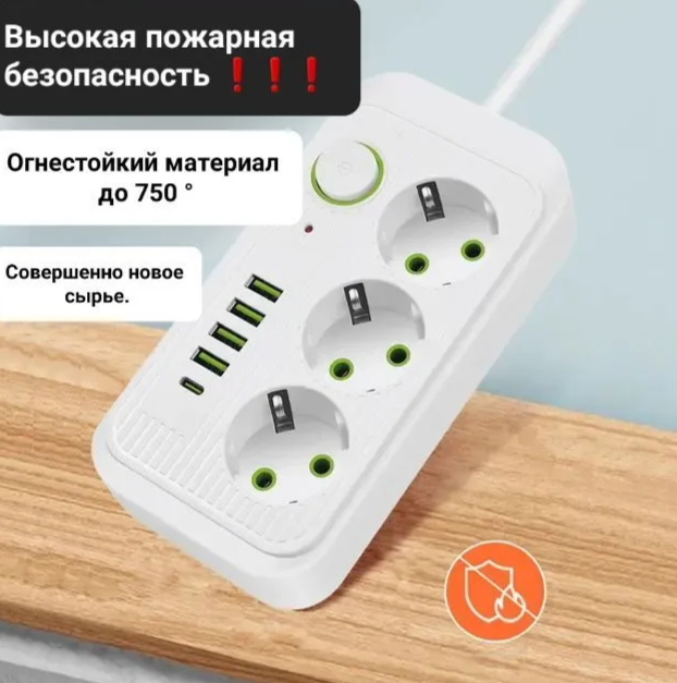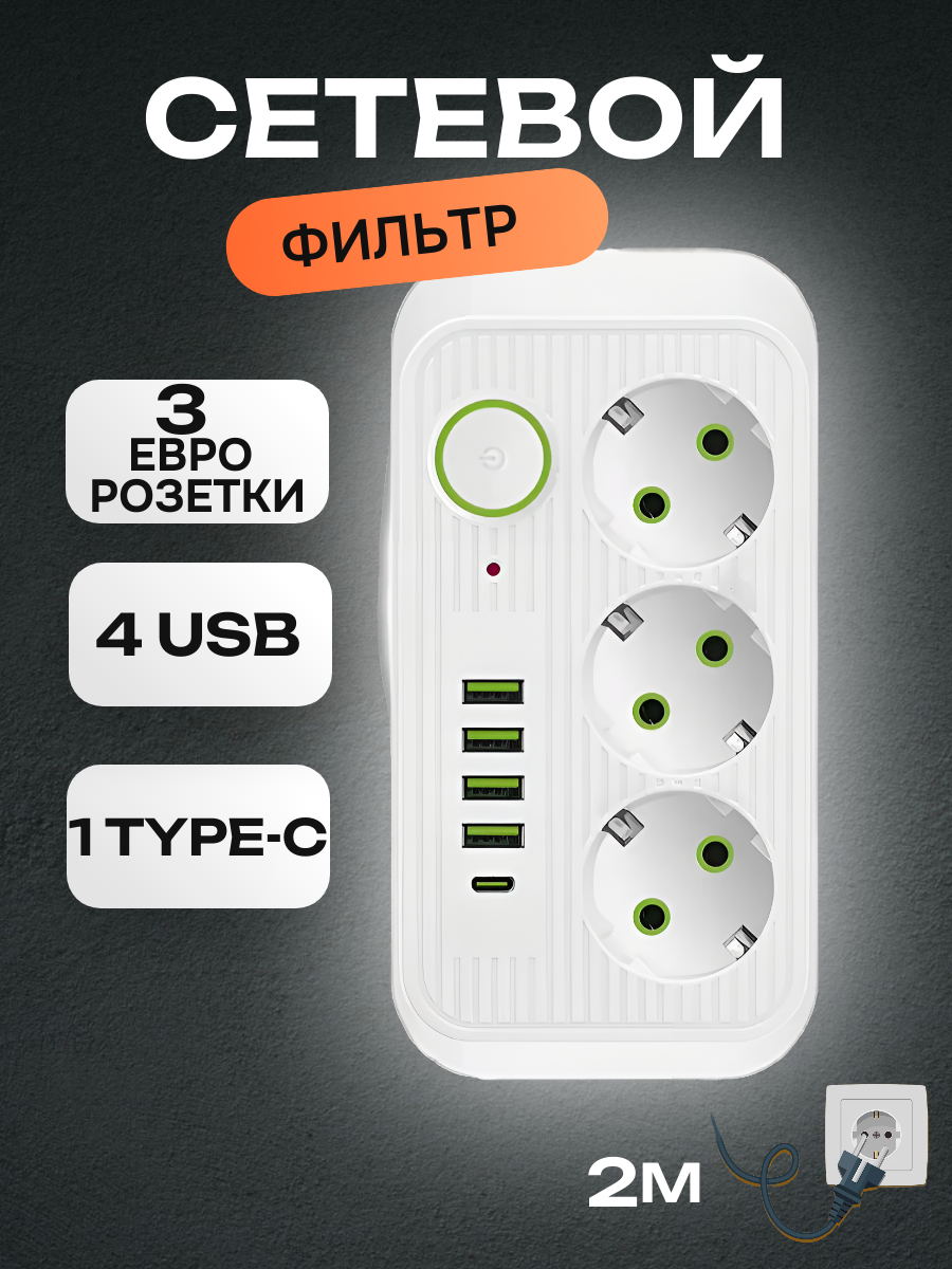 Сетевой фильтр Power Socket 4 розетки 1 type-c 3 евро розетки белый интересное: