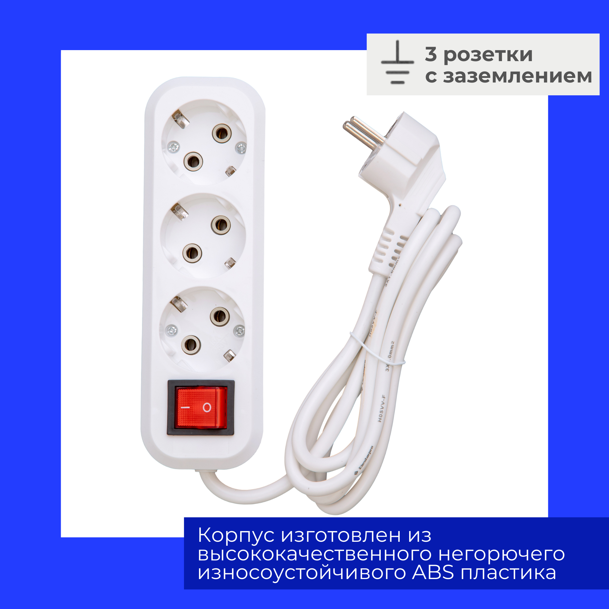 Купить Удлинитель сетевой 3 розетки с заземлением и включателем , 3 метра Elestarpro