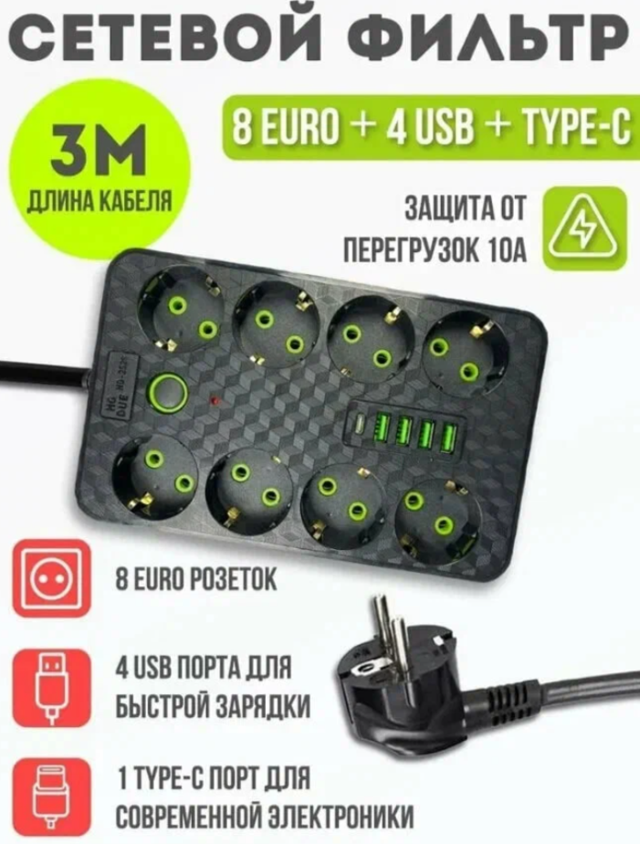 Сетевой фильтр с 8 розетками 4 USB + 1 Type-C / Многофункциональный удлинитель с предохранителем VANVAN интересное: