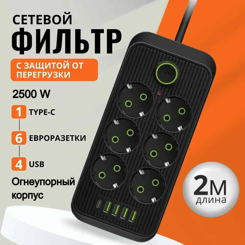 Сетевой фильтр удлинитель с USB и 6 розетками, черный 2 метра от Comfort_Zone интересное: