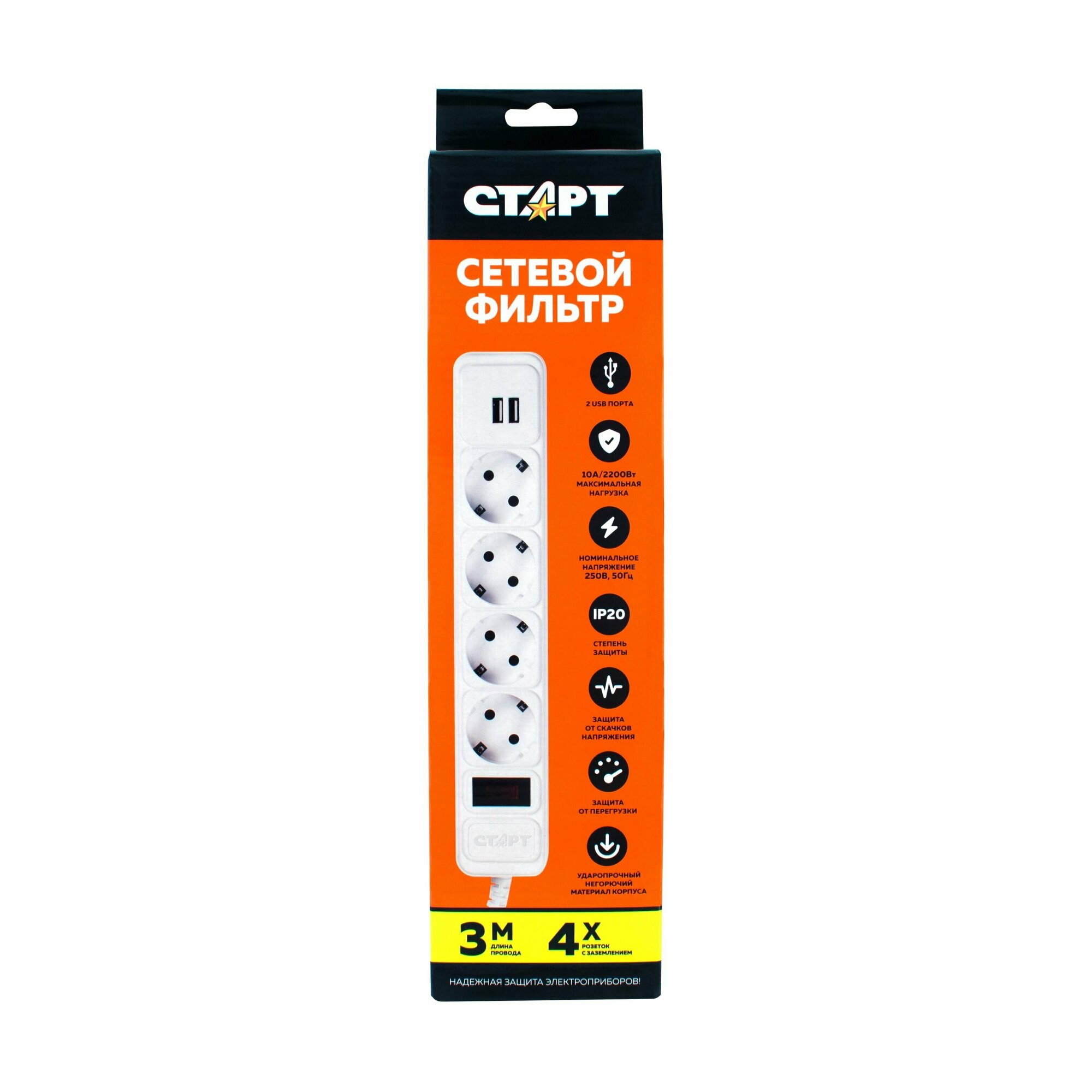 Удлинитель Старт белый, 4 розетки, 3 м, 2USB