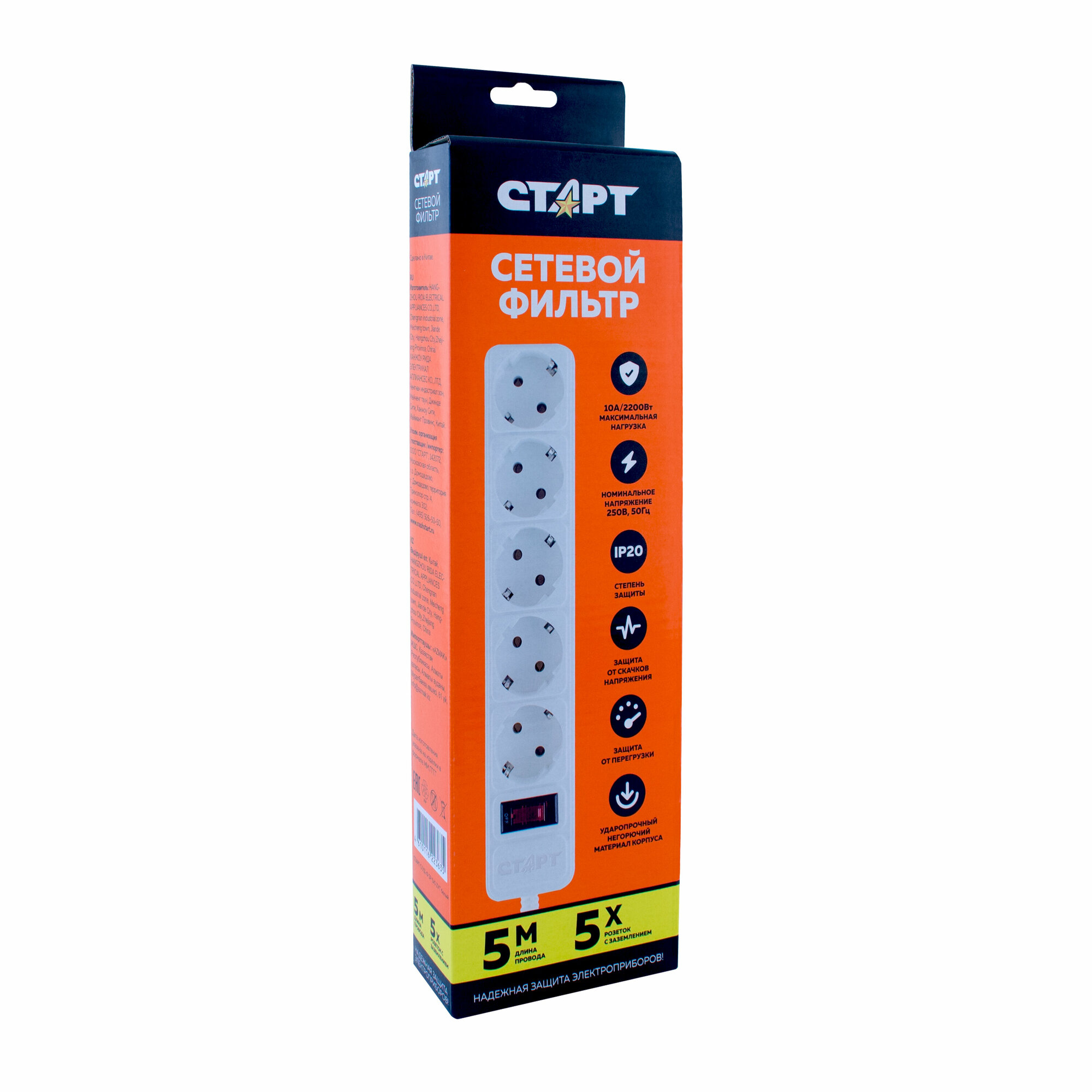 Купить Сетевой фильтр с предохранителем 5м 5 розеток старт удлинитель бытовой с заземлением, защита от перегрузки и скачков напряжения