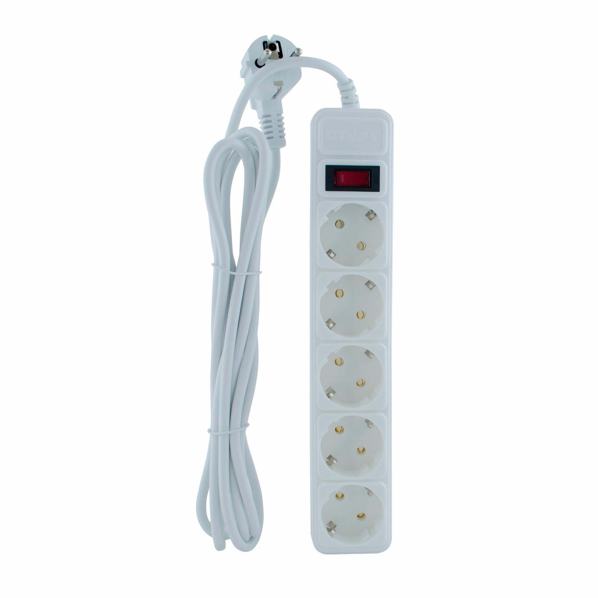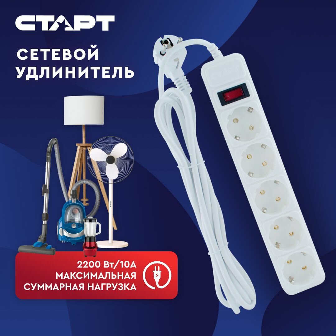 Удлинитель сетевой бытовой 5м старт 3 розетки с выключателем, 10А, ПВС 2х0.75, 2200 Вт