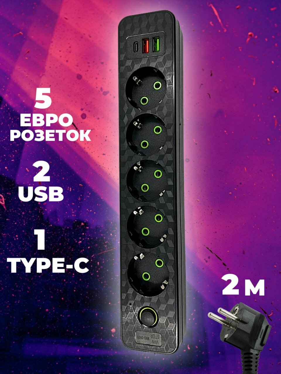 Сетевой фильтр 2 розетки, 2 метра, + 2 USB, 1 Type-C, с выключателем, черный