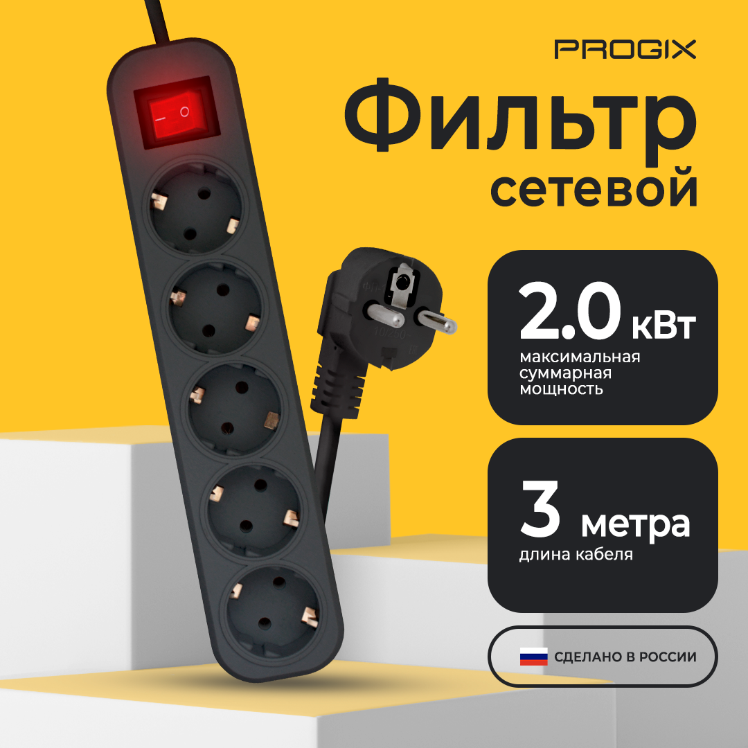 Купить Сетевой фильтр Progix 5 розеток с заземлением, 3 метра, с выключателем, с варистором, без USB, удлинитель черный