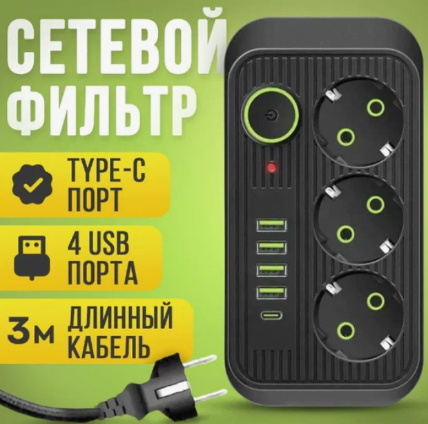 Сетевой фильтр удлинитель 3 метра с 3 розетками 4 USB +1 Type-C 2500 Вт с предохранителем и заземлением черный интересное: