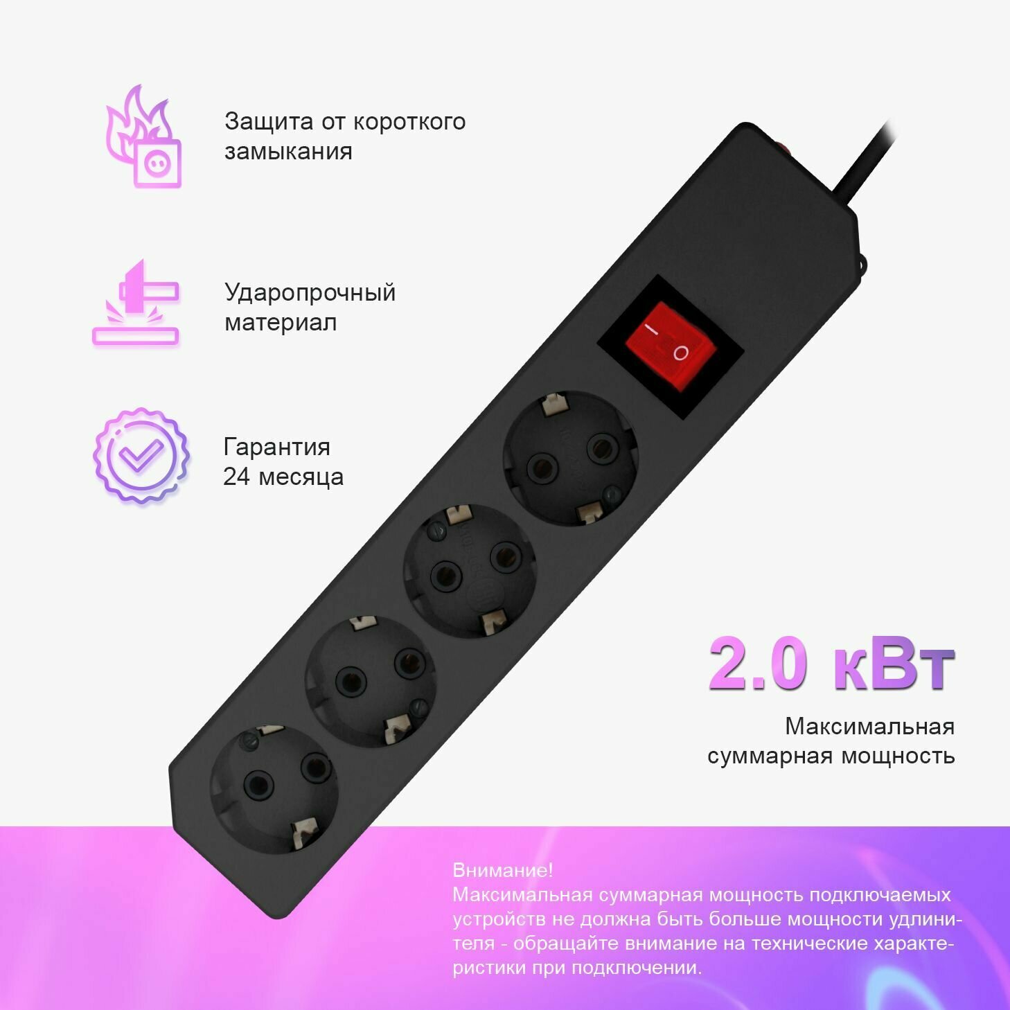 Cетевой фильтр - удлинитель Progix 4 розетки с заземлением, 10А/2кВТ, 2 метра, с выключателем, с предохранителем, без USB, черный интересное: