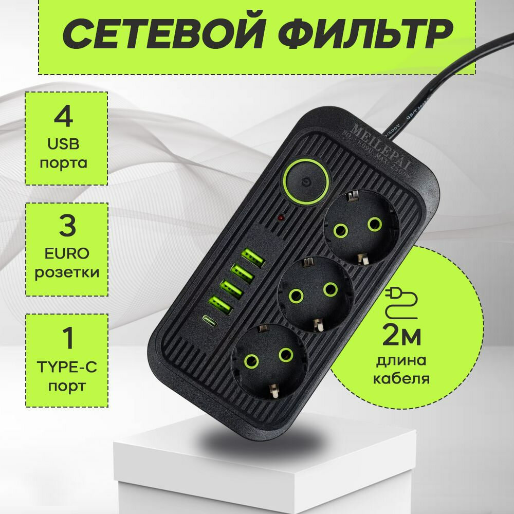 Многофункциональный удлинитель и сетевой фильтр 6 розеток 4USB + 1 Type-C черный 2м от Shark-Shop