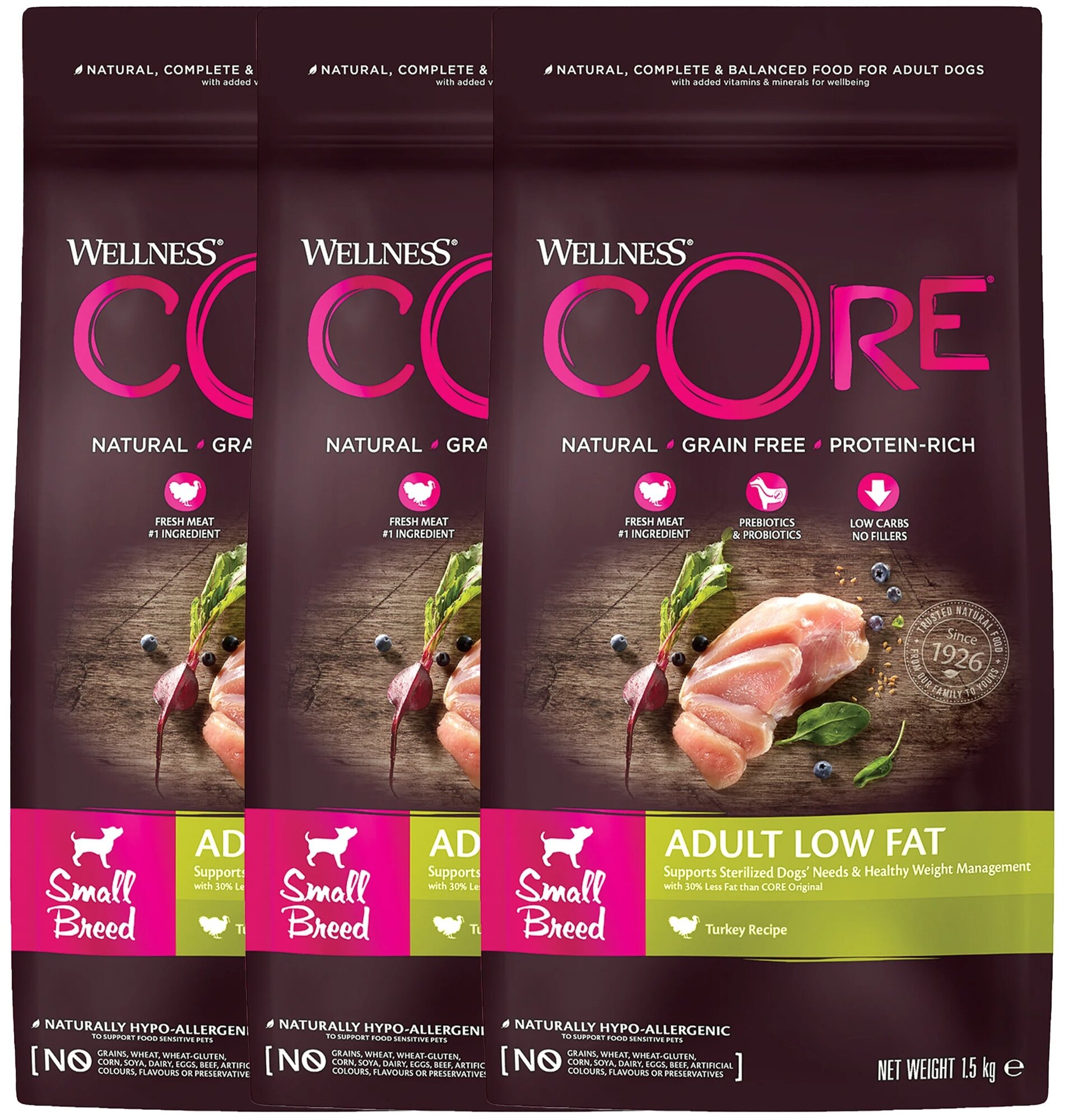 CORE Корм со сниженным содержанием жира из индейки с курицей для взрослых собак мелких пород 1,5 кг х 3 шт.