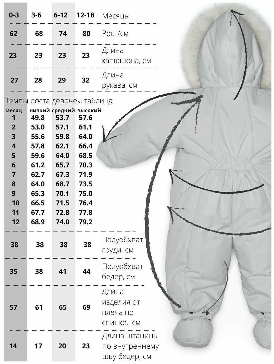 | Подробная комплектация | комбинезон 1 шт, пинетки 1 пара,съемная опушка 1 шт |