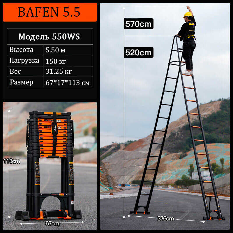 Стремянка телескопическая BAFEN 550WS 5,5 м высота, алюминиевая 14 ступеней, трансформер интересное: