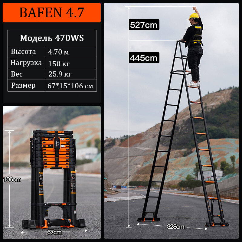 Стремянка телескопическая BAFEN 470WS 4,7 м высота, алюминиевая 12 ступеней, трансформер интересное:
