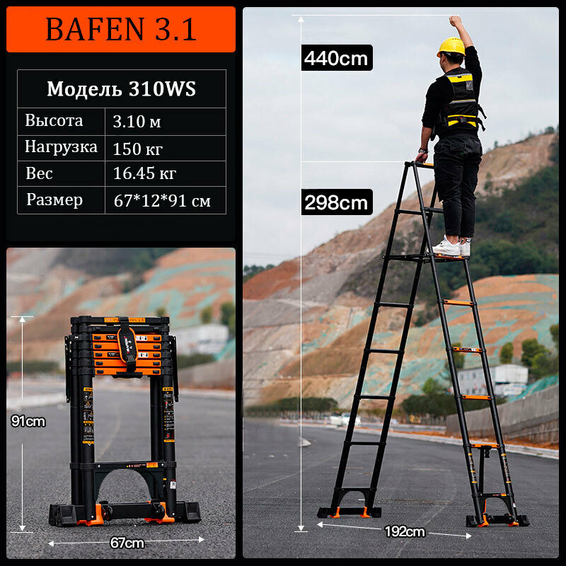 Стремянка телескопическая BAFEN 310WS 3,1 м высота, алюминиевая 8 ступеней, трансформер интересное: