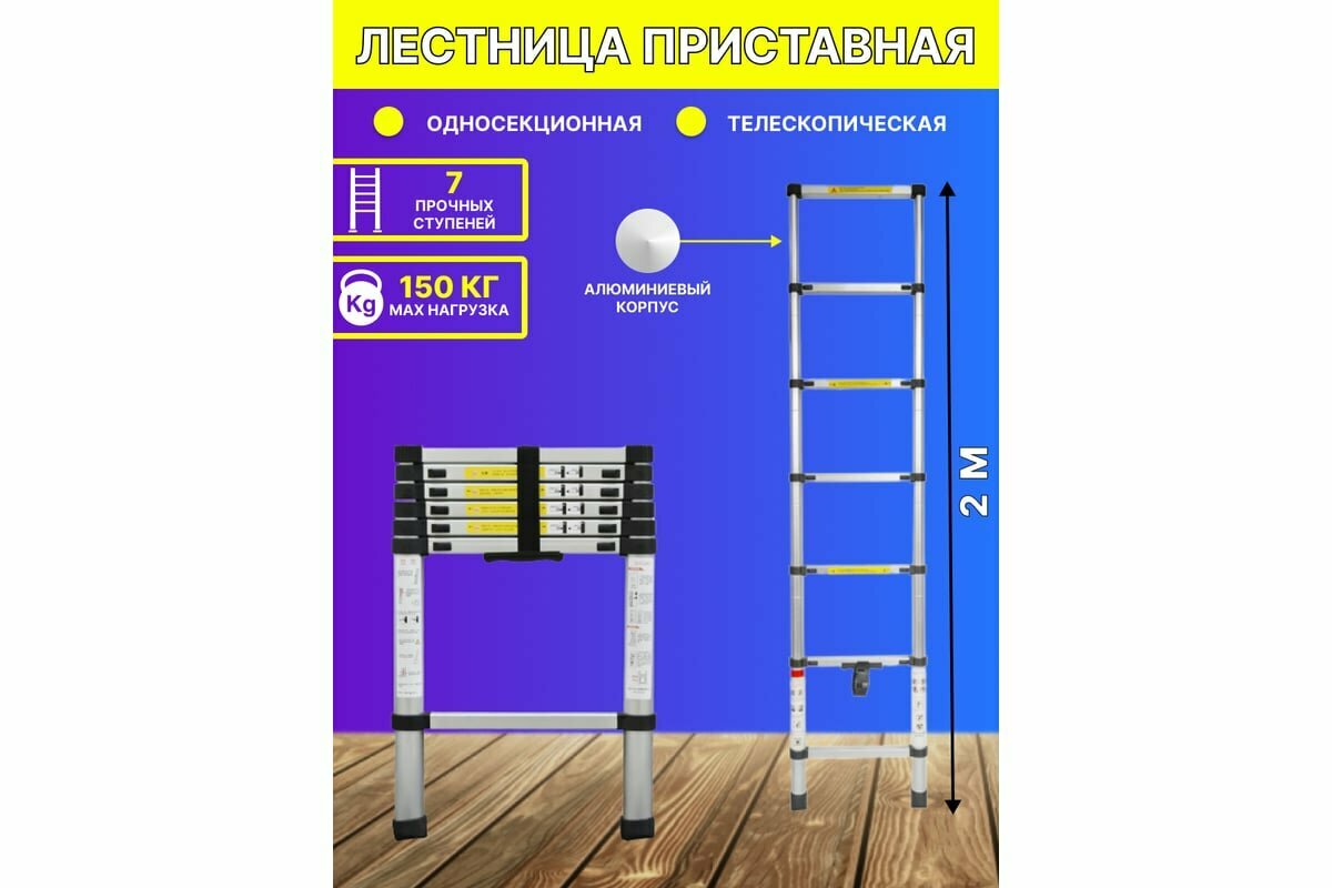 Лестница-стремянка телескопическая алюминиевая двухсекционная (2.0+2.0м,7+7ступенек, max нагрузка 150кг, вес 9.5кг)